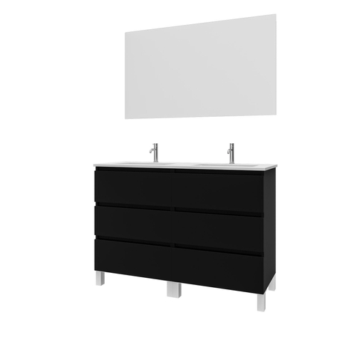Saniclass Chaci PLUS Ensemble meuble de salle de bains - 120x86x46cm - lavabo en céramique blanc - 2 vasques - 2 trous de robinetterie - 6 tiroirs - miroir rectangulaire - noir mat