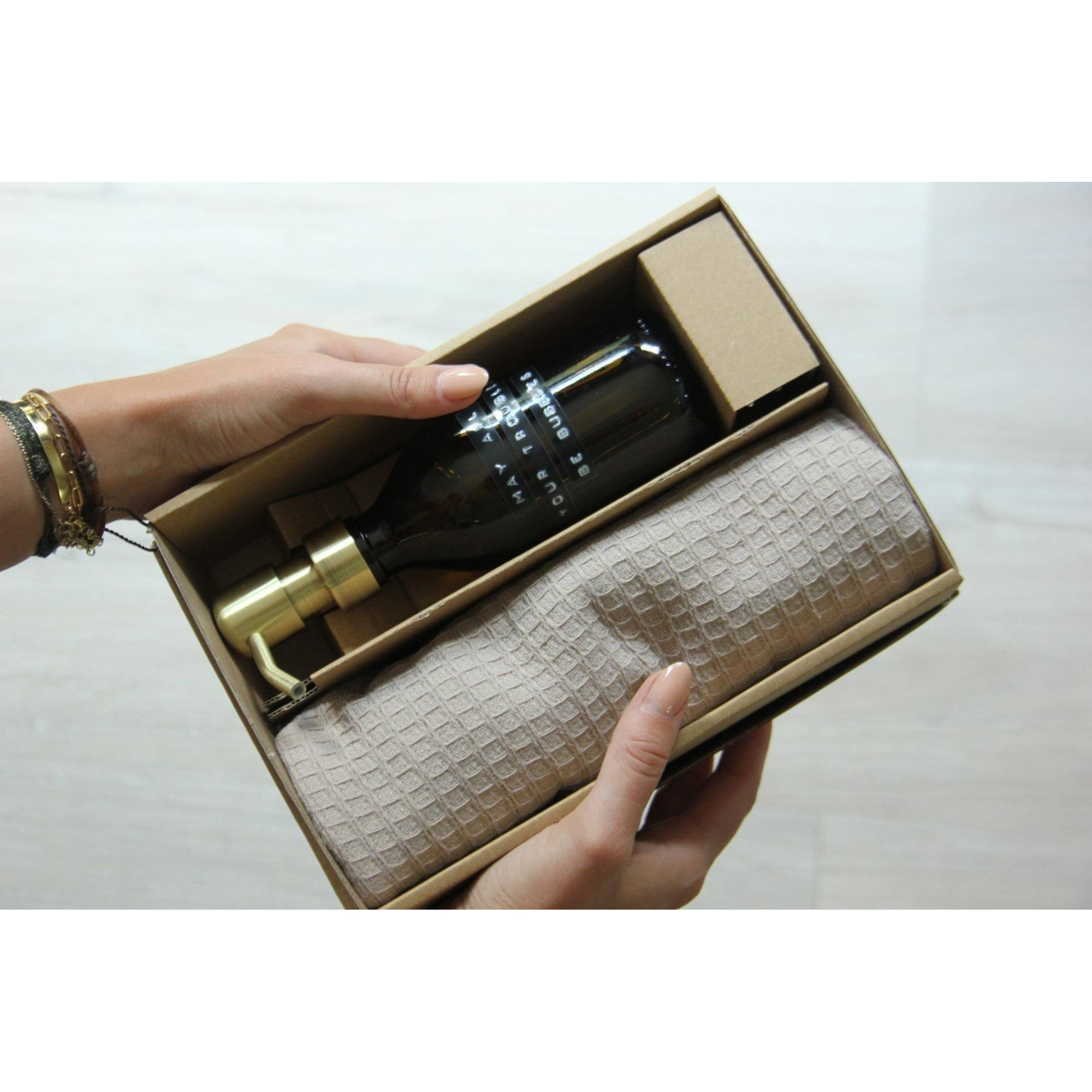 - Coffret cadeau complet avec 250 ml de savon liquide pour les mains et torchon beige de 50x70 cm