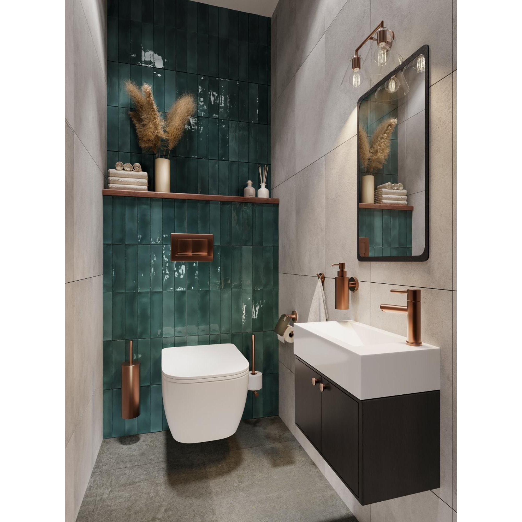 Avec sa finition en cuivre brossé, l'ensemble de brosse WC Haceka Kosmos dégage une pure élégance. Le matériau en cuivre donne une apparence chaleureuse et luxueuse à la salle de bain et constitue un ajout stylé à l'intérieur. Cet ensemble de brosse WC est non seulement fonctionnel, mais aussi un élément décoratif qui transforme la salle de bain en un espace chic.