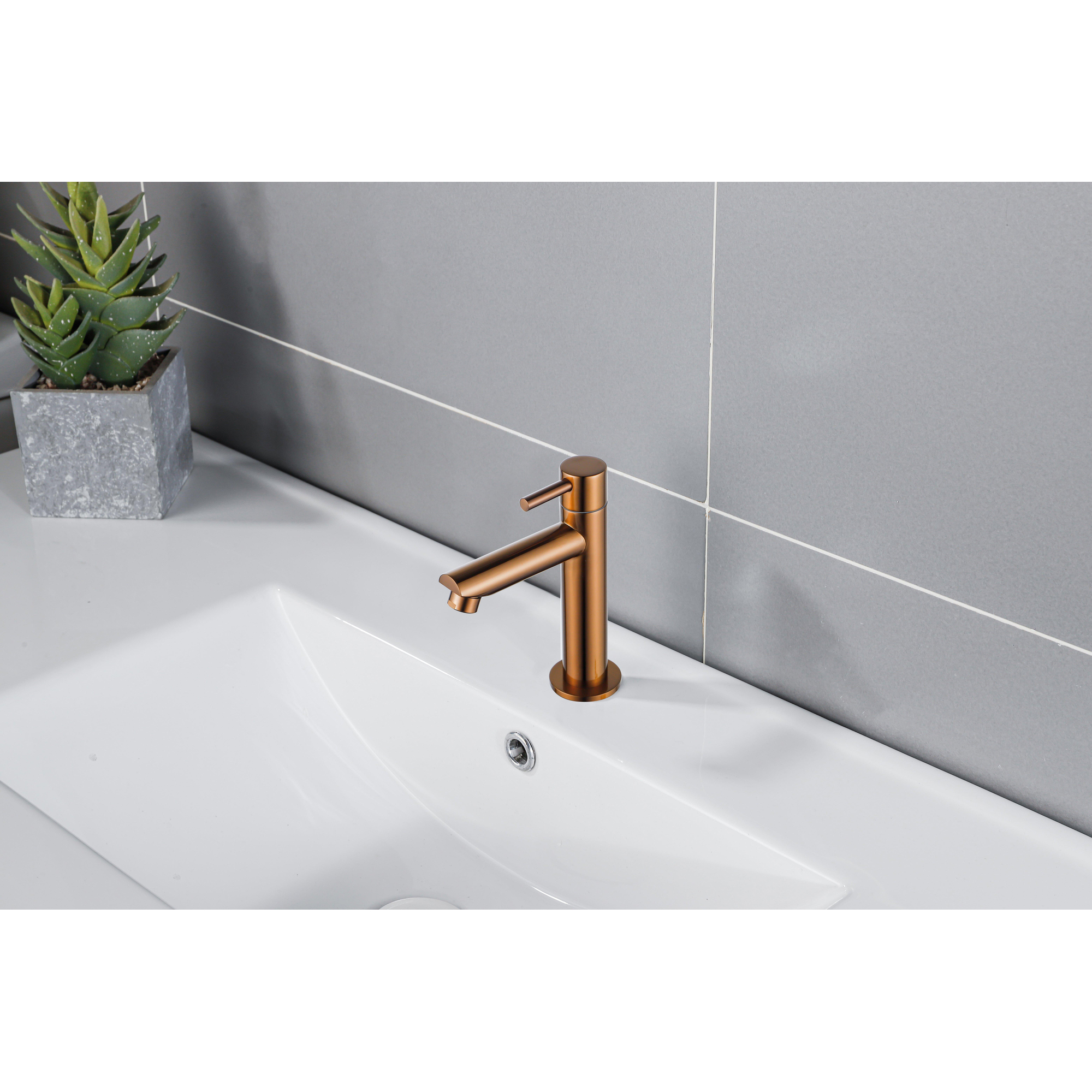 Si vous recherchez un robinet compact et élégant pour vos toilettes ou une petite salle de bains, il s’agit d’un choix particulièrement bien réfléchi. La forme élancée prend peu de place et est idéale pour les petits lavabos de WC ou les tablettes étroites, tandis que la couleur cuivre brossé apporte immédiatement chaleur et caractère à la pièce. Grâce à la base robuste en laiton et au revêtement PVD durable, c’est une solution à laquelle vous ne devrez pas repenser chaque année. Ce robinet de lavabo est particulièrement adapté lorsque vous n’avez besoin que d’eau froide, par exemple dans des toilettes d’invités ou un deuxième WC. Grâce au montage en surface monotrou, l’installation reste simple, ce qui le rend également intéressant si vous souhaitez moderniser un lavabo existant sans travaux de démolition. Vous combinez ainsi un aspect moderne et luxueux avec une utilisation pratique au quotidien.