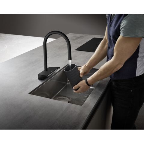 Le robinet est équipé d’une sBox innovante qui range la douchette extractible de manière fluide et ordonnée. Avec trois types de jets différents – un jet douche soyeux, un jet laminaire cristallin et un jet douche puissant – vous choisissez toujours le jet d’eau parfait pour votre tâche. Le support magnétique (MagFit) maintient la douchette solidement en place, tandis qu’un simple bouton permet de changer facilement de mode. Le robinet est également pivotant en quatre positions différentes, vous permettant de toujours trouver la position idéale. Tout cela rend le travail en cuisine plus efficace et agréable.
