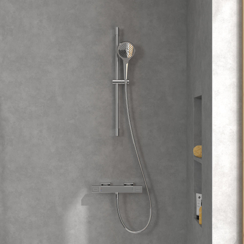 - Mitigeur thermostatique de douche avec réglage sécurisé de la température et compensation de pression pour un jet d'eau stable.