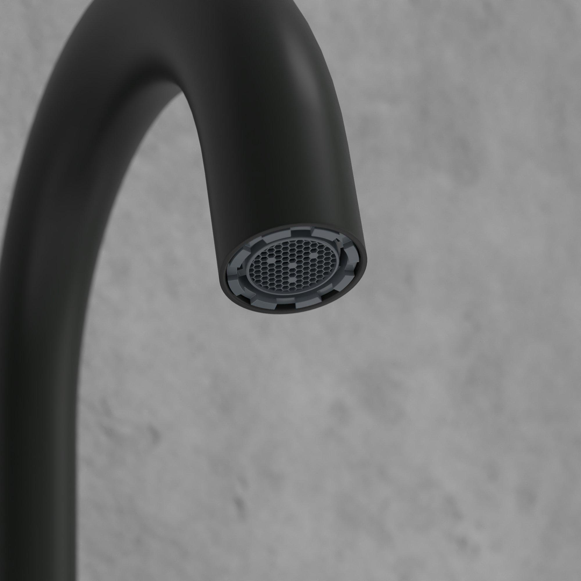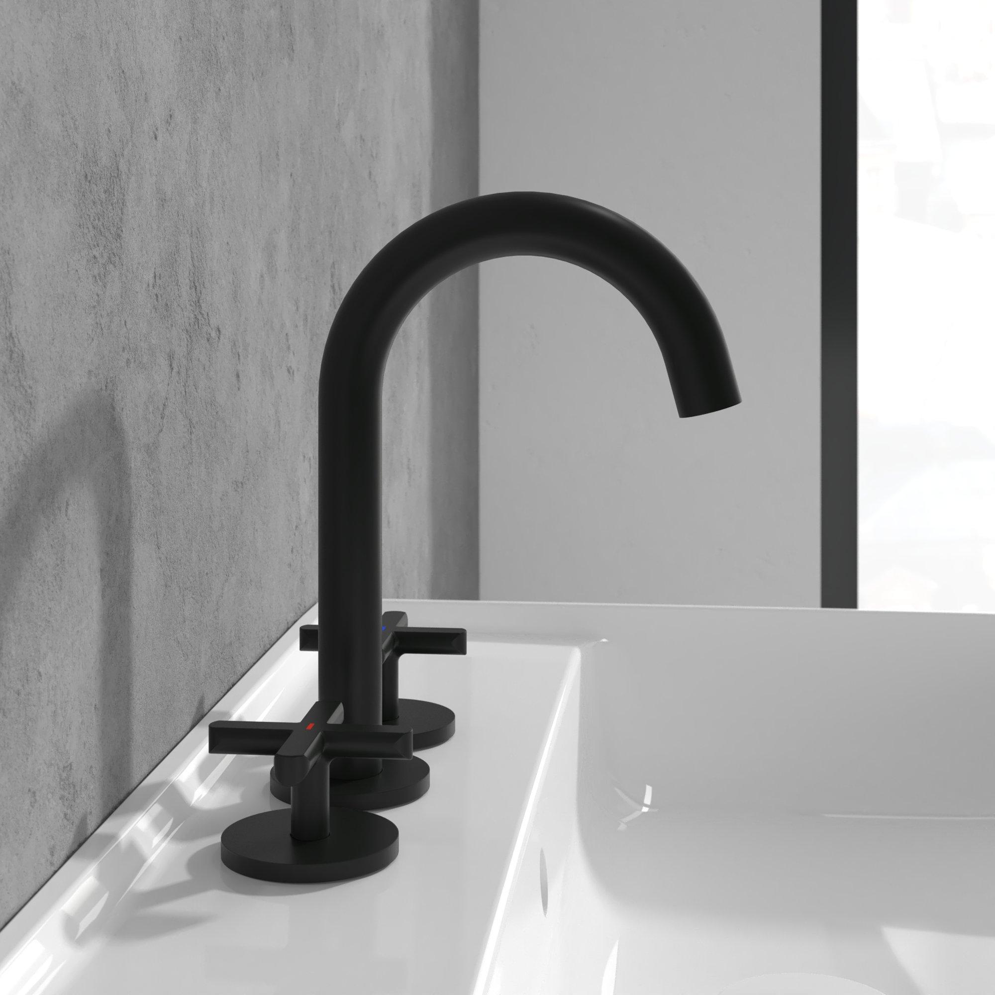 Avec ce robinet de lavabo à trois trous, vous ajoutez en une seule fois design, confort et durabilité à votre salle de bains. La combinaison des formes élancées, du bec courbé et de la finition noire mate en fait un choix parfait pour les salles de bains modernes et minimalistes, mais aussi pour les styles hôtel chic ou industriels. Grâce à une technique bien pensée, ce robinet n'est pas seulement un plaisir pour les yeux, il est aussi agréable à utiliser au quotidien : le jet d'eau est plein et doux, tout en permettant une utilisation responsable de l'eau. Ce modèle est particulièrement adapté si vous recherchez une solution haut de gamme pour un meuble de salle de bains ou un lavabo design, où des lignes épurées et une apparence ordonnée sont importantes. Si vous optez pour un ensemble complet et parfaitement assorti, ce robinet s'accorde à merveille avec d'autres produits de la même collection, mais il se marie tout aussi bien avec des lavabos intemporels en céramique ou en pierre.