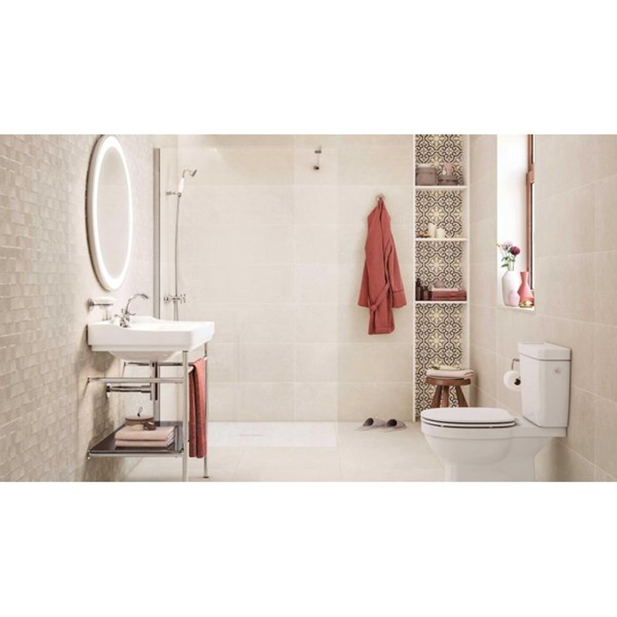 - Se combine parfaitement avec des tons bois, des détails noirs et du sanitaire blanc pour un ensemble intemporel