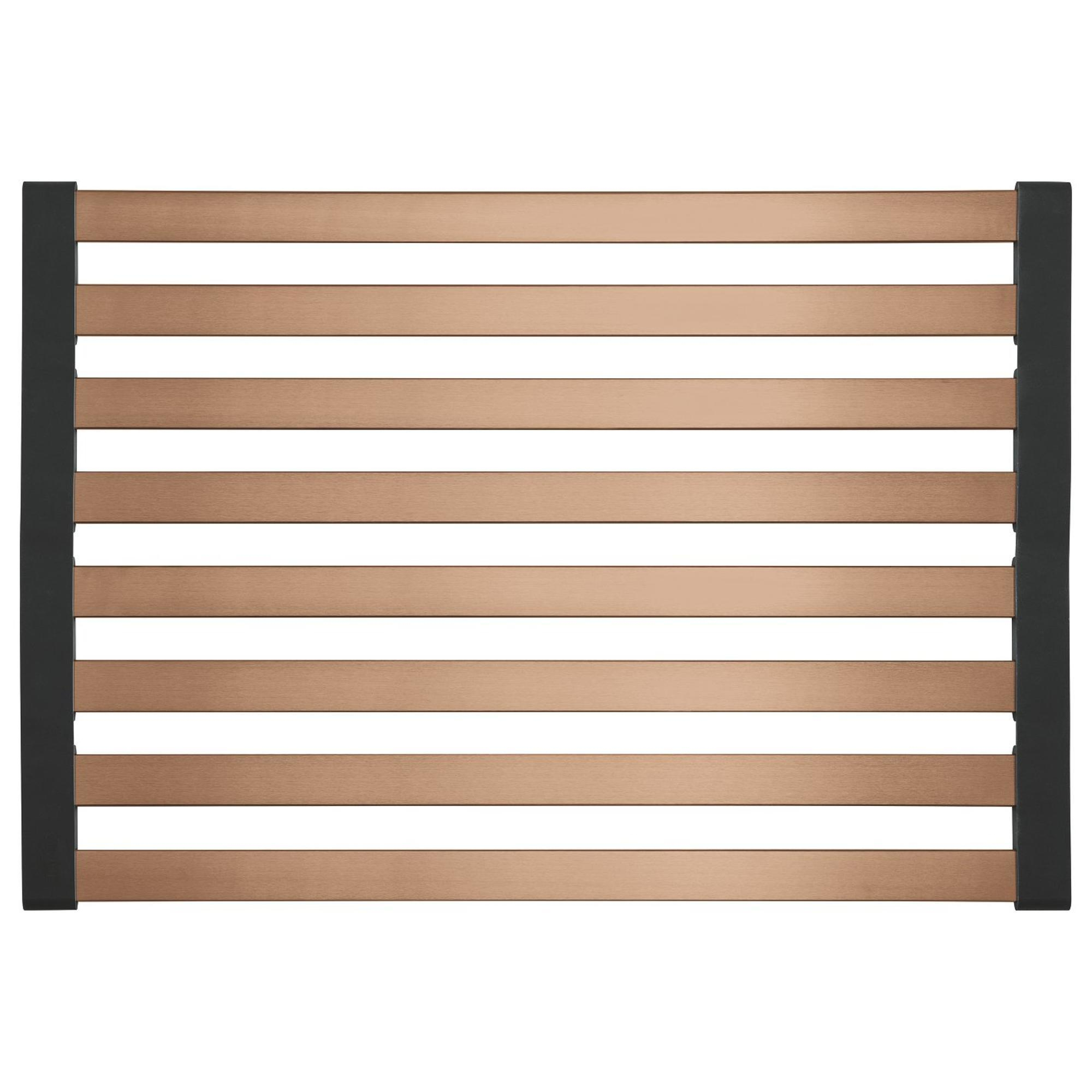 Cette étagère multifonctionnelle apporte immédiatement plus de confort et de style dans votre cuisine. Grâce à ses dimensions généreuses, elle offre un espace supplémentaire pour faire sécher rapidement et efficacement des verres, des assiettes ou des casseroles. Grâce à la surface résistante à la chaleur, vous pouvez même y poser des poêles à frire ou des plats sortant du four, sans craindre d’endommagement. L’étagère est spécialement conçue pour s’adapter au-dessus de l’évier, de sorte que l’eau puisse s’écouler directement et que votre cuisine reste bien ordonnée. De plus, elle est facile à plier, ce qui vous permet de la ranger de manière compacte après utilisation et d’économiser un espace précieux. La combinaison d’une structure robuste en acier inoxydable et d’une élégante finition warm sunset brossée assure non seulement une grande durabilité, mais également une allure chaleureuse et contemporaine qui complète votre cuisine.Élégant