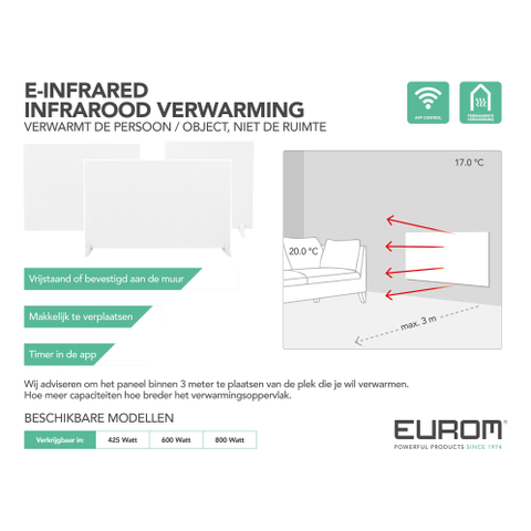 Découvrez la beauté du Eurom E-infrared Panneau infrarouge - 63.8x64cm - IP24 - 425watt - sol/mur - Vertical - métal blanc mat. Ce magnifique panneau combine fonctionnalité avec un design épuré et moderne, ce qui en fait un ajout élégant à toute salle de bains ou pièce. Avec ses dimensions de 63.8x64cm et sa finition métallique blanche mate, ce panneau infrarouge s’intègre parfaitement dans tout intérieur et offre une chaleur agréable où vous le souhaitez.