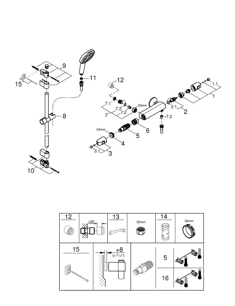 GROHE Grohtherm 1000 Ensemble de douche - mitigeur de douche thermostatique - entraxe=15cm - avec ensemble barre de douche - 60cm - douchette carrée - 2 jets - flexible de douche lisse - chrome