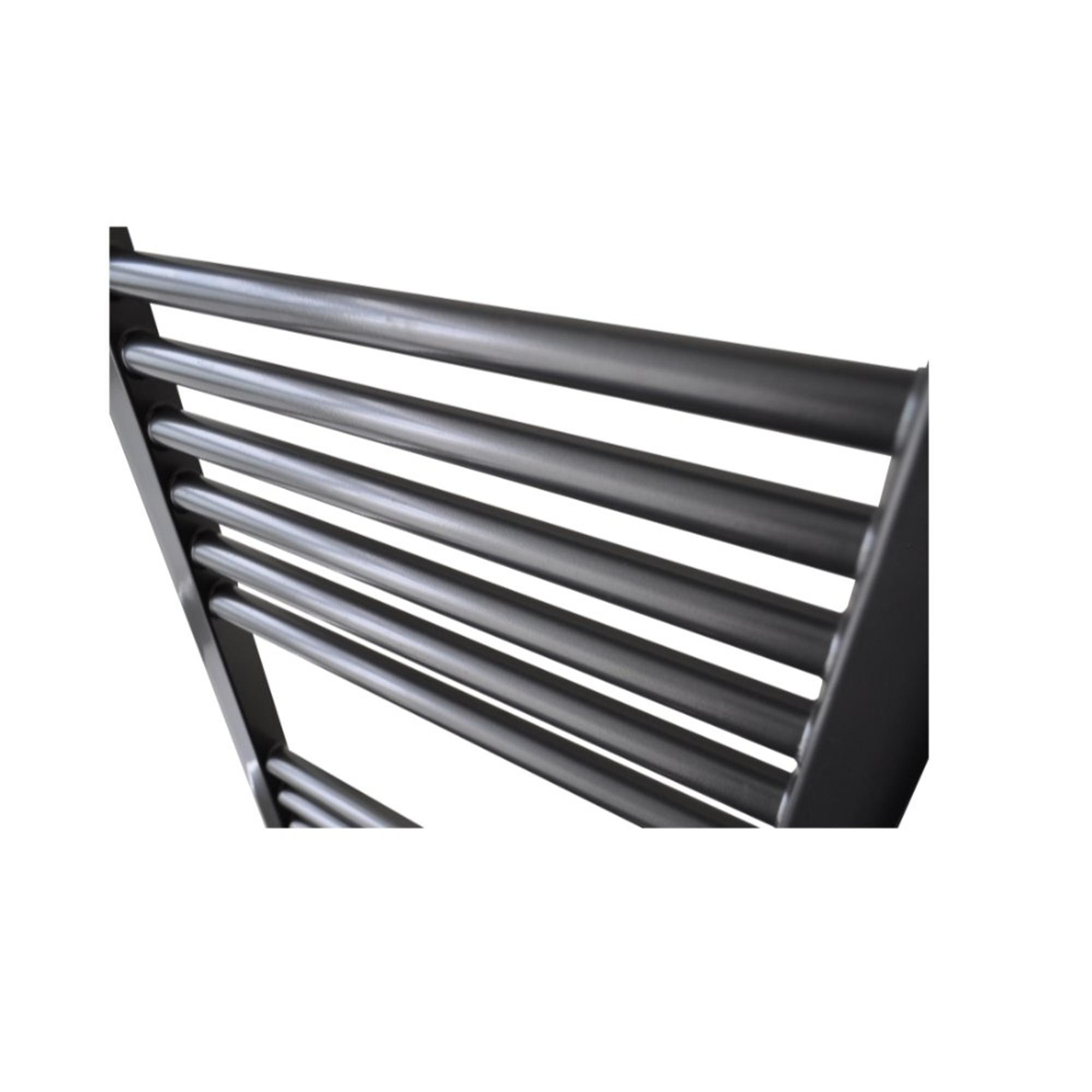 Avec sa finition gunmetal et sa forme droite et épurée, ce radiateur est un véritable point focal dans toute salle de bains. Le design est minimaliste et moderne, s’intégrant parfaitement à divers styles d’intérieur. Le thermostat noir en bas à droite ajoute un contraste subtil, donnant à l’ensemble une apparence luxueuse. Ainsi, vous combinez fonctionnalité et esthétique raffinée qui améliore votre salle de bains sans la dominer.