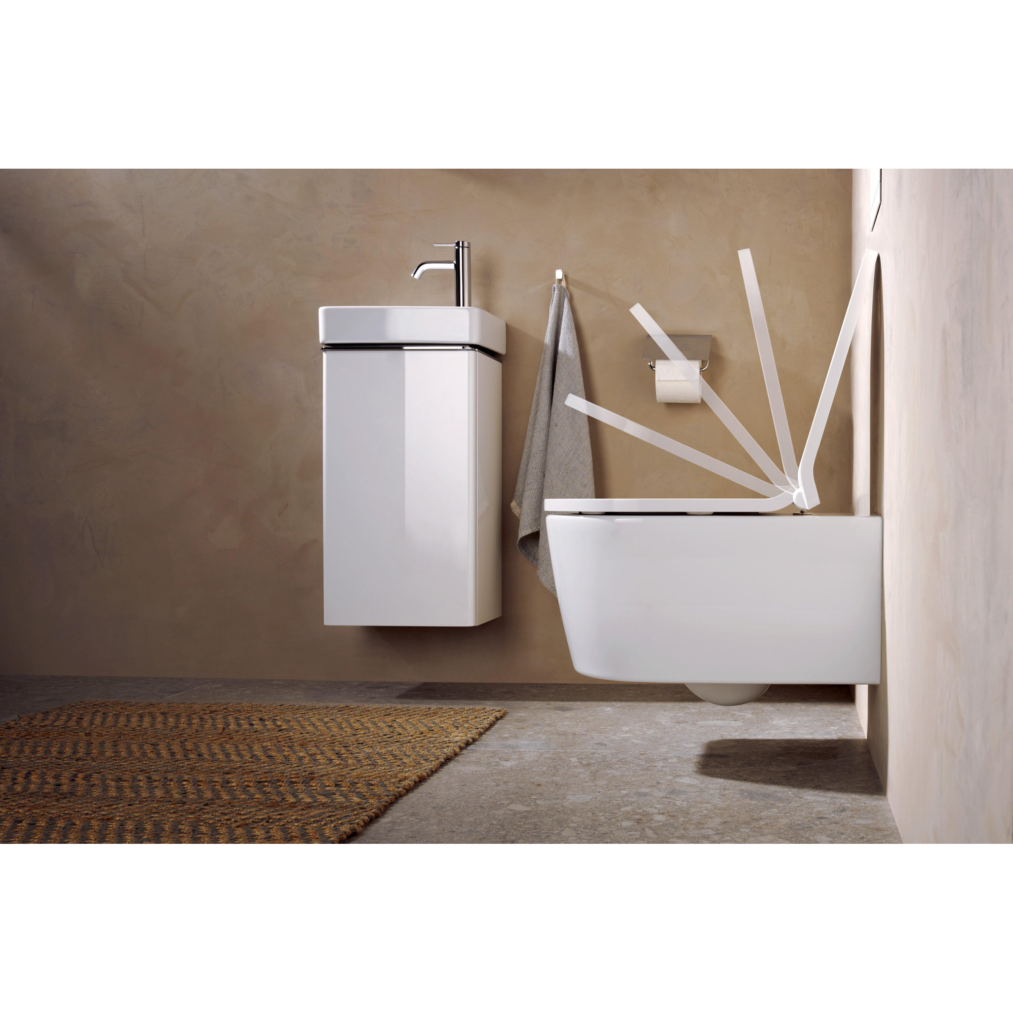 La céramique lisse avec surface SmartClean fait en sorte que les gouttes d’eau et la saleté adhèrent moins rapidement. Vous le remarquez immédiatement lors du nettoyage : un chiffon doux et un produit d’entretien doux suffisent généralement pour redonner de l’éclat au lavabo. Le calcaire se forme moins vite et les résidus de savon se rincent facilement. Comme il n’y a pas de trop-plein, vous avez en outre moins de rebords et de recoins où la saleté peut s’accumuler, ce qui est bénéfique pour l’hygiène. Cela rend ce lavabo particulièrement adapté aux toilettes très fréquentées, aux familles avec enfants ou à toute personne souhaitant un espace frais et hygiénique sans devoir consacrer beaucoup de temps à l’entretien.