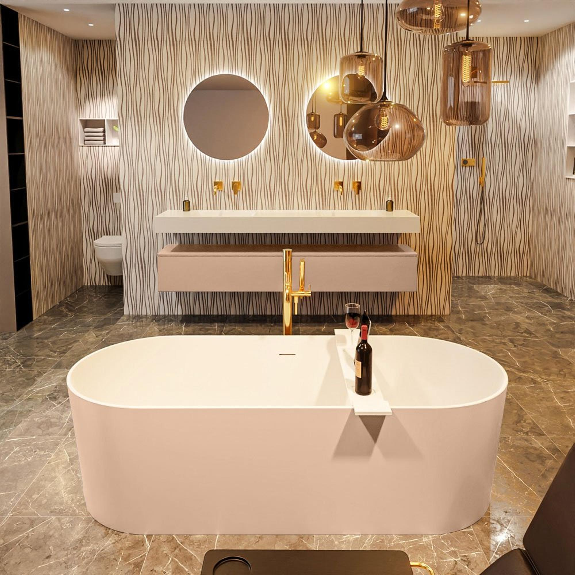 Cette baignoire autoportante respire le style et l’élégance grâce à ses lignes épurées et à la combinaison de couleurs unique Rosee et Talc. La surface mate n’offre pas seulement une sensation luxueuse, elle est également facile à nettoyer et à entretenir. La baignoire est un mélange harmonieux de design moderne et de beauté intemporelle, ce qui en fait un atout pour toute salle de bains.