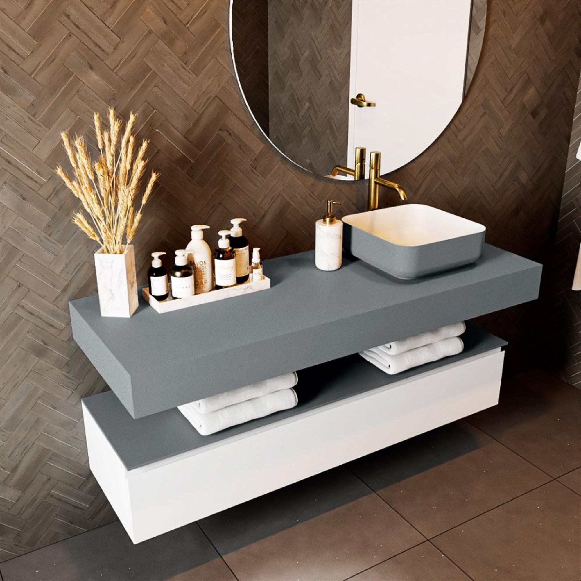 Avec ce plan vasque suspendu, vous créez en une seule fois une base calme et moderne pour votre configuration de lavabo. Grâce à la largeur généreuse de 140 cm, il est idéal pour une grande salle de bains familiale, mais aussi parfait dans une atmosphère d'hôtel de luxe ou une élégante master bathroom. La profondeur de 51 cm vous offre suffisamment d'espace de travail autour de votre vasque, sans que l'ensemble paraisse massif. Comme le plan est suspendu, le sol reste dégagé et votre salle de bains semble plus grande et plus aérée - pratique si vous aimez un intérieur ordonné et minimaliste. La construction solide en solid surface dans la douce teinte grise Plata associe un design épuré à des avantages pratiques : le toucher est agréable, la finition est joliment mate et se combine parfaitement avec des vasques blanches, noires ou en pierre naturelle ainsi qu’avec des robinets noirs ou chromés. Vous aimez décider vous-même de l’aménagement de votre meuble ou vous souhaitez simplement un plan vasque aérien et flottant au-dessus d’un beau mur carrelé ? Alors ce plan est un choix intelligent et pérenne.