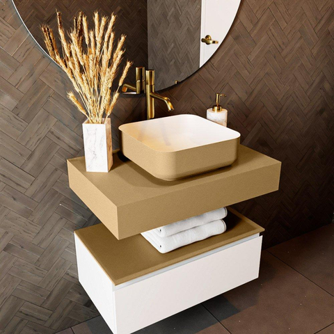 Avec ce plan vasque suspendu, vous créez en une seule fois une base luxueuse et apaisante pour votre aménagement de lavabo. La dimension généreuse de 70x46 cm offre suffisamment d'espace pour une vasque, des accessoires et les routines quotidiennes, sans que l'ensemble paraisse massif. Grâce à la fixation murale, le plan semble flotter, ce qui est idéal si vous souhaitez créer une salle de bains moderne, d'inspiration hôtel chic ou design, aussi bien dans une petite salle de bains urbaine que dans un vaste espace bien-être à la maison. La teinte dorée chaude s'accorde parfaitement avec les tendances actuelles aux finitions or brossé, noir et matériaux naturels, tandis que le design épuré reste intemporel. Le matériau solid surface est doux et agréable au toucher, de haute qualité et durable, ce qui rend ce plan très adapté à une utilisation quotidienne intensive par toute la famille ou dans une salle de bains d'appoint élégante.