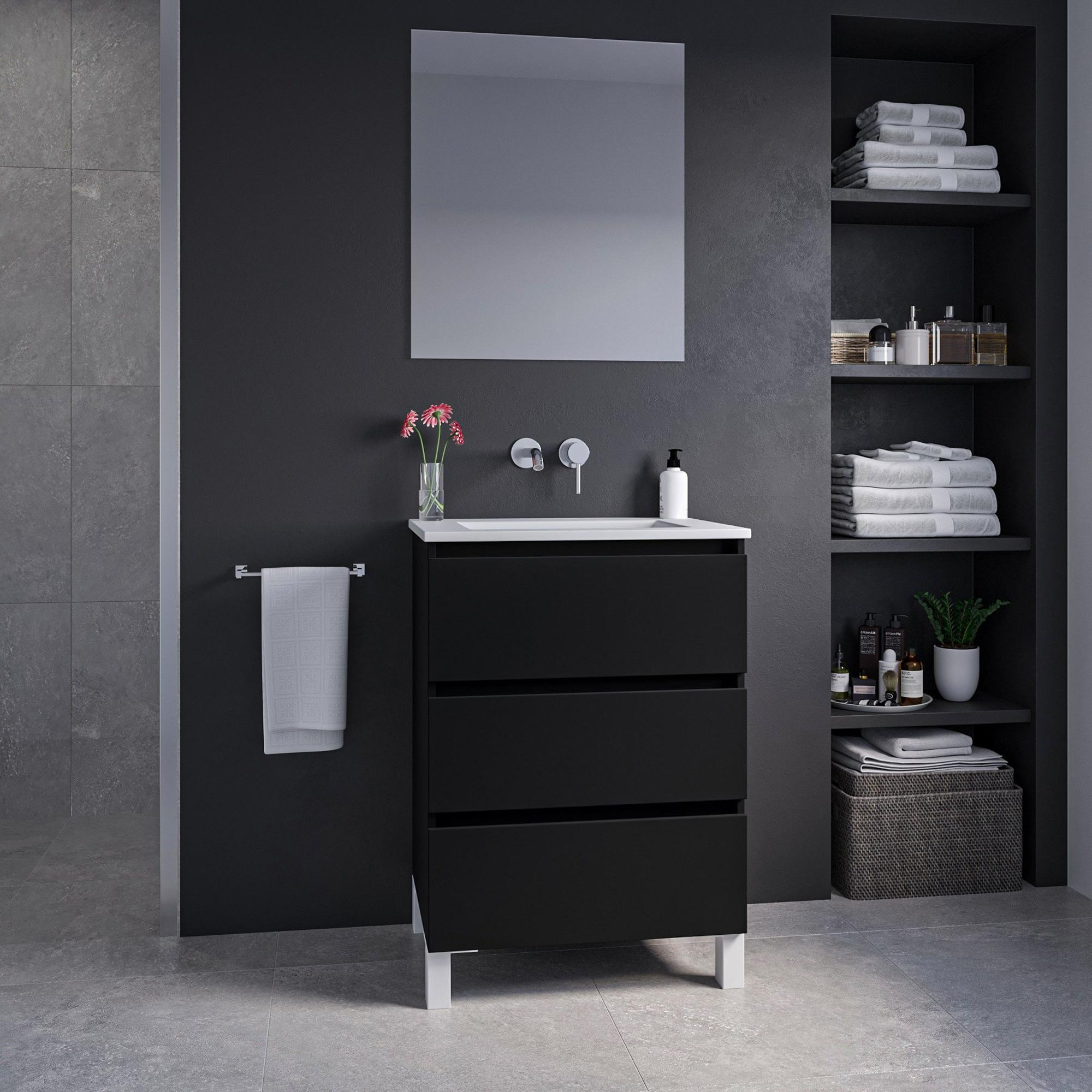 Saniclass Chaci PLUS Ensemble meuble de salle de bains - 60x86x46cm - lavabo blanc - 3 tiroirs - miroir rectangulaire - noir mat