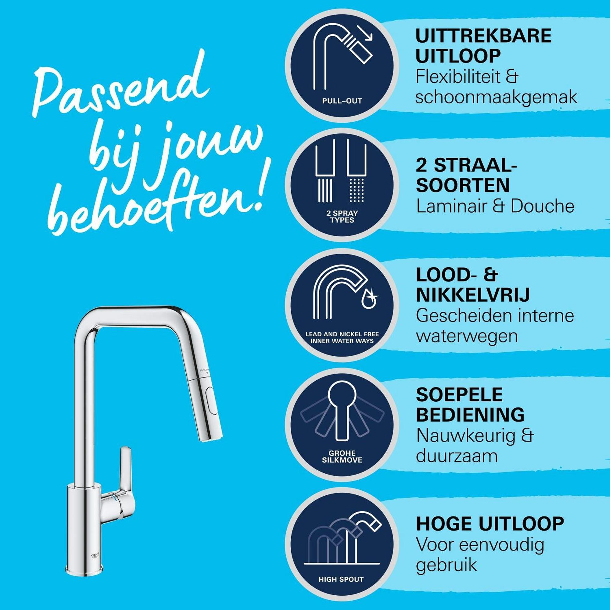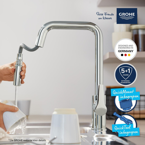 Le robinet de cuisine à une poignée GROHE Start avec mousseur rétractable à deux types de jets – la manière rapide de donner un coup de pouce au style et à la commodité de votre cuisine à un prix très attractif