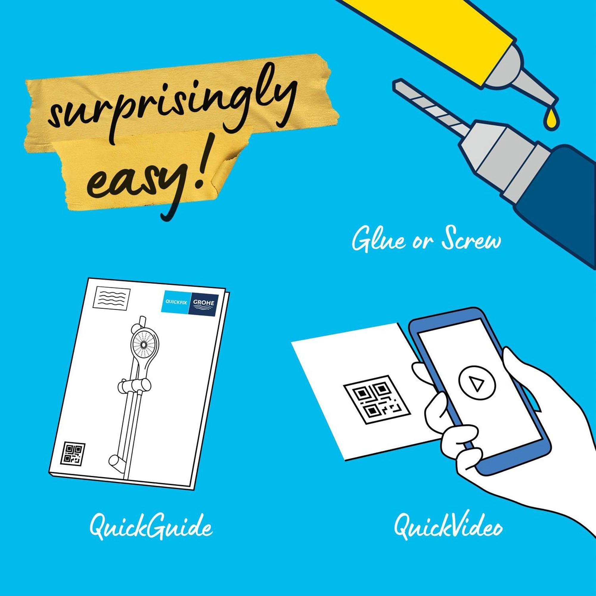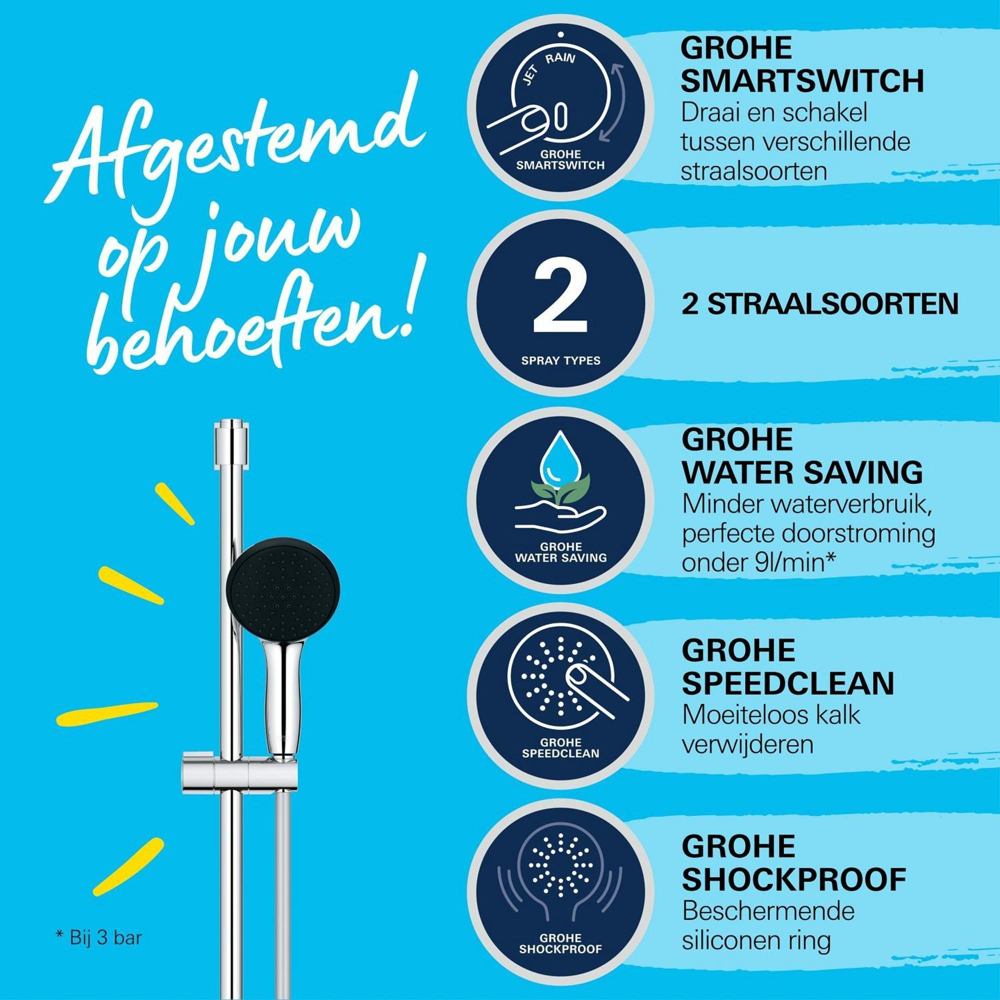 Cet ensemble de douche se distingue immédiatement par sa finition chromée brillante et intemporelle qui s'intègre aisément dans chaque style de salle de bains. Le design minimaliste aux formes rondes confère une apparence moderne et fraîche, rendant votre salle de bains immédiatement plus luxueuse. La barre de douche présente une forme subtile et fonctionnelle, ce qui la rend non seulement esthétique, mais aussi pratique à l'usage. Grâce à la finition GROHE Long-Life Finish durable, la surface reste brillante et sans rayures pendant des années, même en cas d'utilisation quotidienne intensive. Vous investissez ainsi dans un produit qui rend non seulement votre salle de bains plus belle, mais qui conserve également sa valeur.