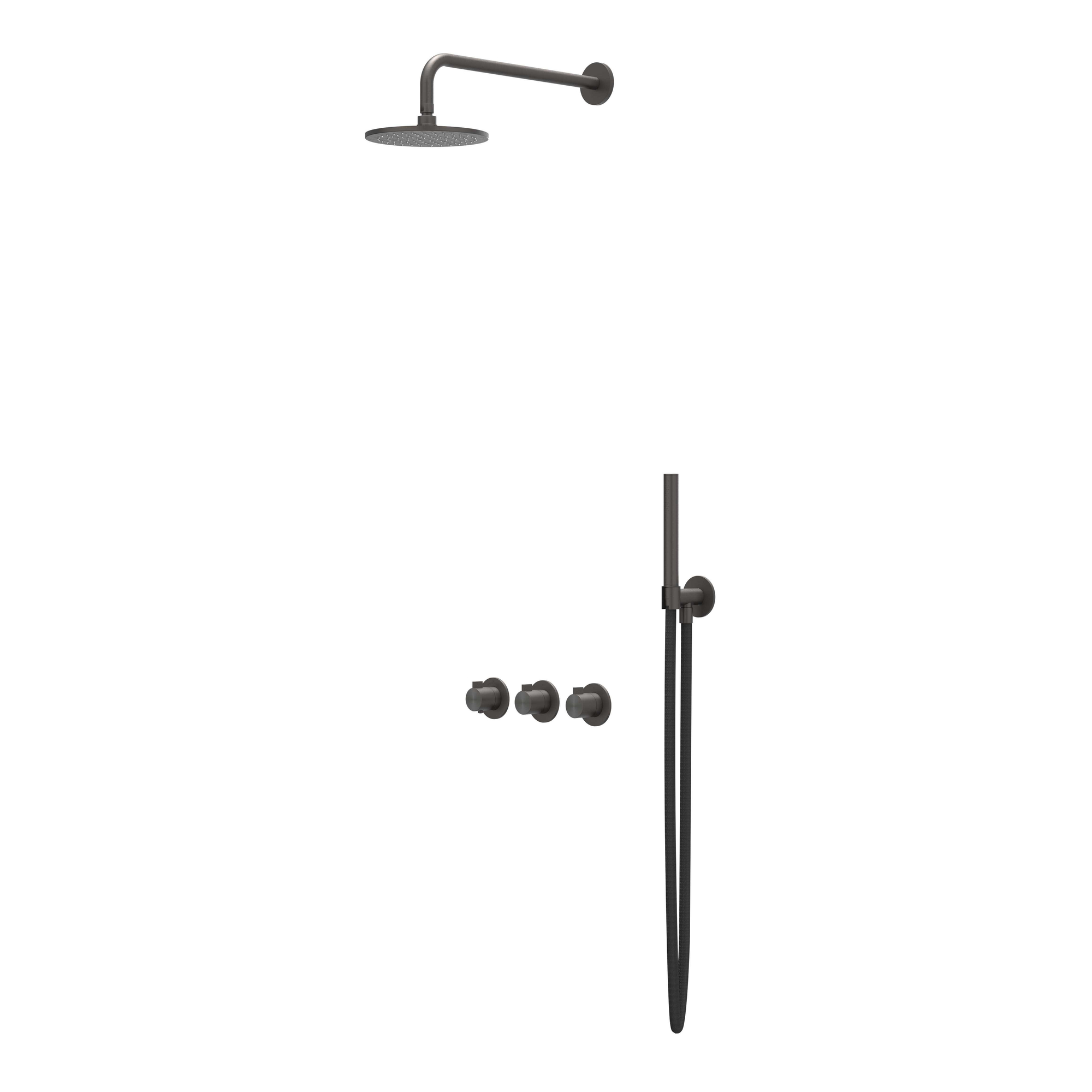 IVY Tribe Ensemble de douche pluie - encastré - symmetry - 2 robinets d'arrêt - bras mural 40cm - pomme de douche principale medium 20cm - barre de douche avec sortie - flexible de douche 150cm - douchette bâton - ACIER INOXYDABLE 316 - PVD noir carbone b