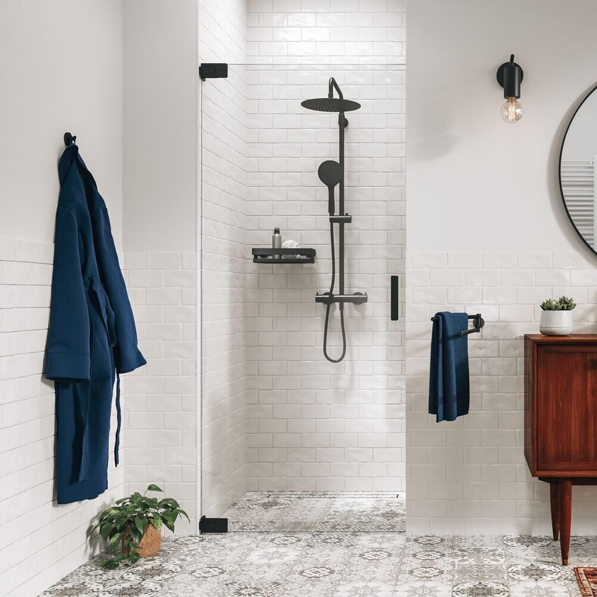 Le verre transparent en combinaison avec les profilés et charnières noirs mats donne immédiatement à votre salle de bains une apparence haut de gamme. La porte de niche s’adapte parfaitement aux configurations de douche rectangulaires et convient parfaitement aux salles de bains industrielles, modernes ou minimalistes. Comme le verre est entièrement transparent, votre carrelage reste bien visible et l’espace paraît visuellement plus grand, ce qui est un avantage majeur surtout dans les salles de bains plus petites. La finition noire mate est revêtue, ce qui assure une couleur homogène et un look luxueux qui se marie parfaitement avec des robinets, des ensembles de douche et des accessoires noirs. Vous créez ainsi facilement une ligne de style uniforme dans votre salle de bains, sans devoir tout remplacer en même temps.