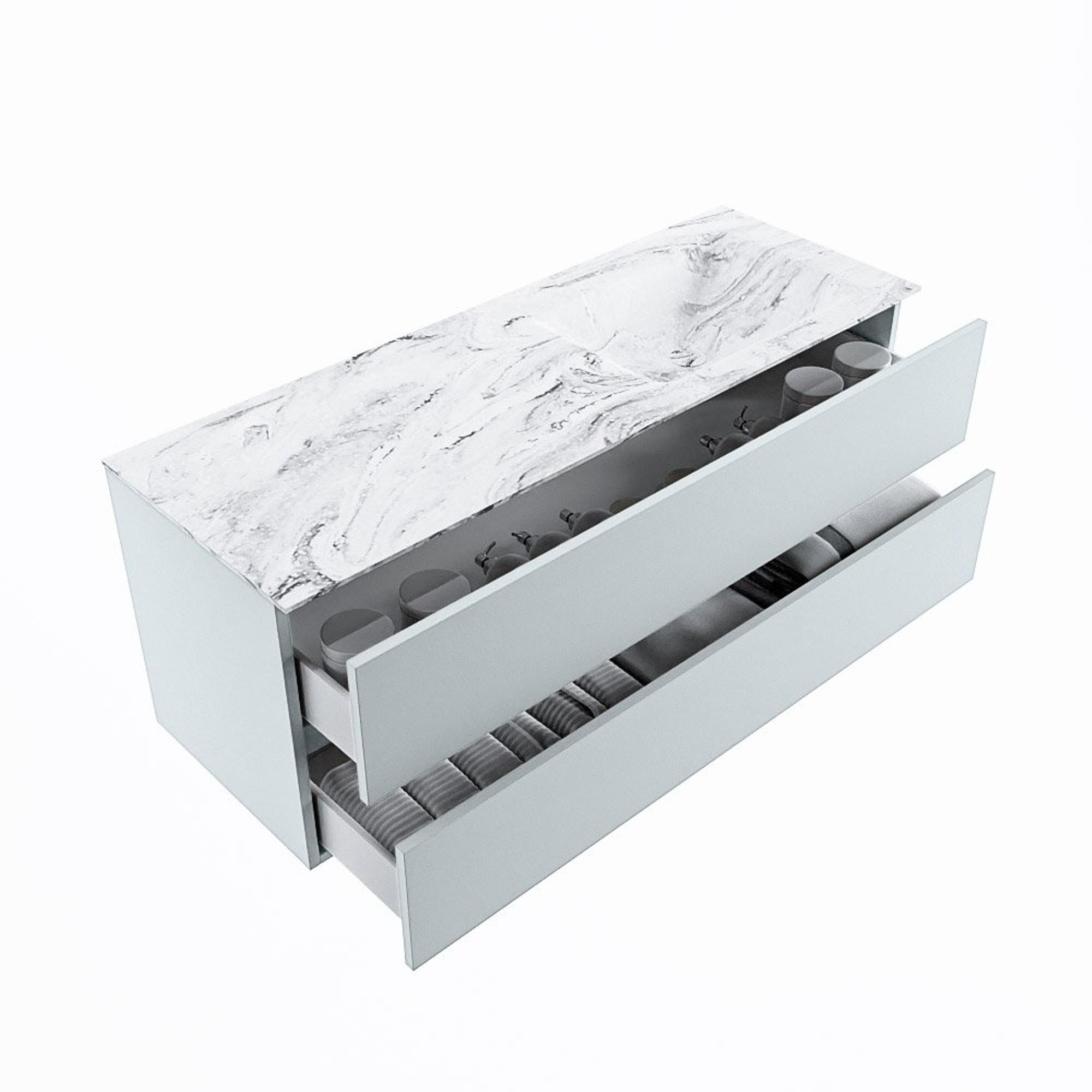 Le très beau set de meuble de salle de bains VICA DLUX est une magnifique pièce maîtresse dans votre salle de bains. Le lavabo en Solid surface marbré de CORIAN a une apparence élégante et intemporelle. Grâce à la forme douce et naturelle du lavabo, combinée avec le sous-meuble de salle de bains intemporel et magnifique, le VICA-DLUX s’adapte bien aux différents styles de salles de bains. Pour compléter totalement le style de votre salle de bains, nous proposons également les niches et supports de miroir dans la même couleur que le lavabo. Comme les niches Mondiaz et les tablettes de miroir. La série VICA DLUX se compose du sous-meuble VICA à 2 ou 4 tiroirs combiné avec un lavabo Solid surface CORIAN avec structure marbre. Le lavabo Solid surface CORIAN est disponible en 5 aspects marbre. Avec cet ensemble de meuble de salle de bains, vous avez ce bel aspect marbre mais également la facilité d’entretien et l’hygiène du Solid surface. Attention : Pour la variante XL (60cm) vous voyez les images/vidéos de la hauteur standard (50cm)