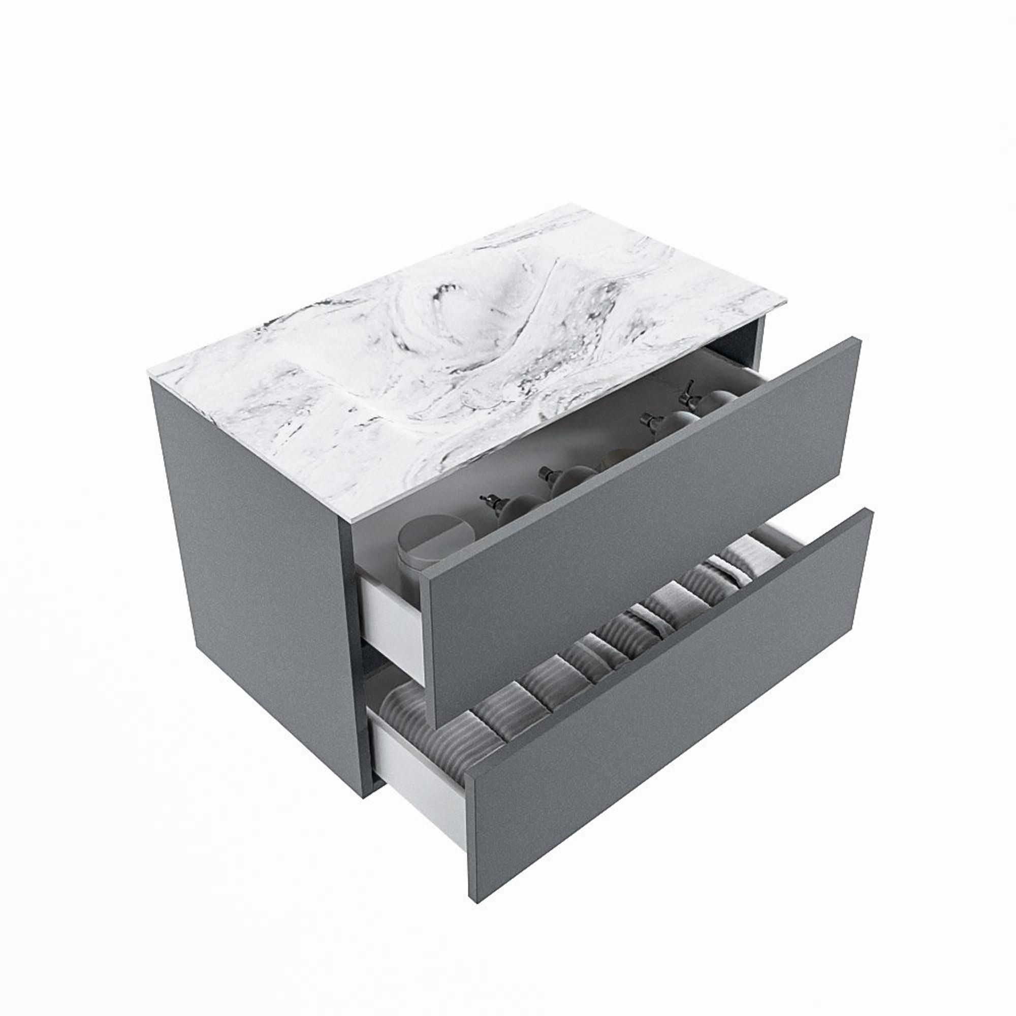 Le magnifique ensemble de meuble de salle de bains VICA DLUX est une superbe pièce maîtresse dans votre salle de bains. Le lavabo en Solid surface marbré de CORIAN a une apparence élégante et intemporelle. Grâce à la forme douce et naturelle du lavabo, combinée avec le meuble bas de salle de bains intemporel et magnifique, le VICA-DLUX s’adapte bien aux différents styles de salles de bains. Pour parfaire entièrement le style de votre salle de bains, nous proposons également les niches et les supports de miroir dans la même couleur que le lavabo, comme les niches Mondiaz et les tablettes de miroir. La série VICA DLUX se compose du meuble bas VICA à 2 ou 4 tiroirs combiné avec un lavabo en Solid surface CORIAN avec une structure marbre. Le lavabo Solid surface CORIAN est disponible en 5 looks marbre. Avec cet ensemble de meuble de salle de bains, vous avez ce bel aspect marbre mais également la facilité d’entretien et l’hygiène du Solid surface. Attention : pour la variante XL (60cm), vous voyez les images/vidéos de la hauteur standard (50cm)