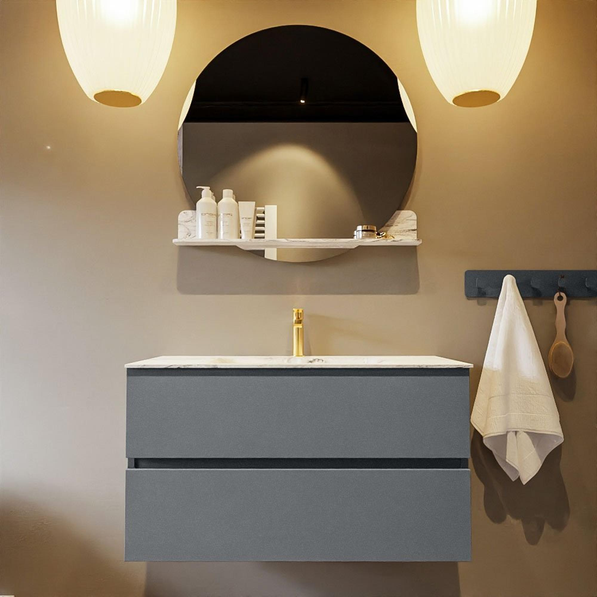 Le superbe ensemble de meuble de salle de bains VICA DLUX est une pièce maîtresse magnifique dans votre salle de bains. Le lavabo Solid surface marbré en CORIAN a une apparence élégante et intemporelle. Grâce à la forme douce et naturelle du lavabo, combinée avec le sous-meuble de salle de bains intemporel et magnifique, le VICA-DLUX s’adapte bien aux différents styles de salles de bains. Pour parfaire la finition de votre salle de bains, nous proposons également des niches et des supports de miroir dans la même couleur que le lavabo. Comme les niches Mondiaz et les tablettes de miroir. La série VICA DLUX se compose du sous-meuble VICA à 2 ou 4 tiroirs combiné avec un lavabo Solid surface CORIAN avec structure marbre. Le lavabo Solid surface CORIAN est disponible en 5 aspects marbre. Avec cet ensemble de meubles de salle de bains, vous avez ce bel aspect marbre mais aussi la facilité d’entretien et l’hygiène du Solid surface. Attention : Pour la variante XL (60cm), vous voyez les images/vidéos de la hauteur standard (50cm)