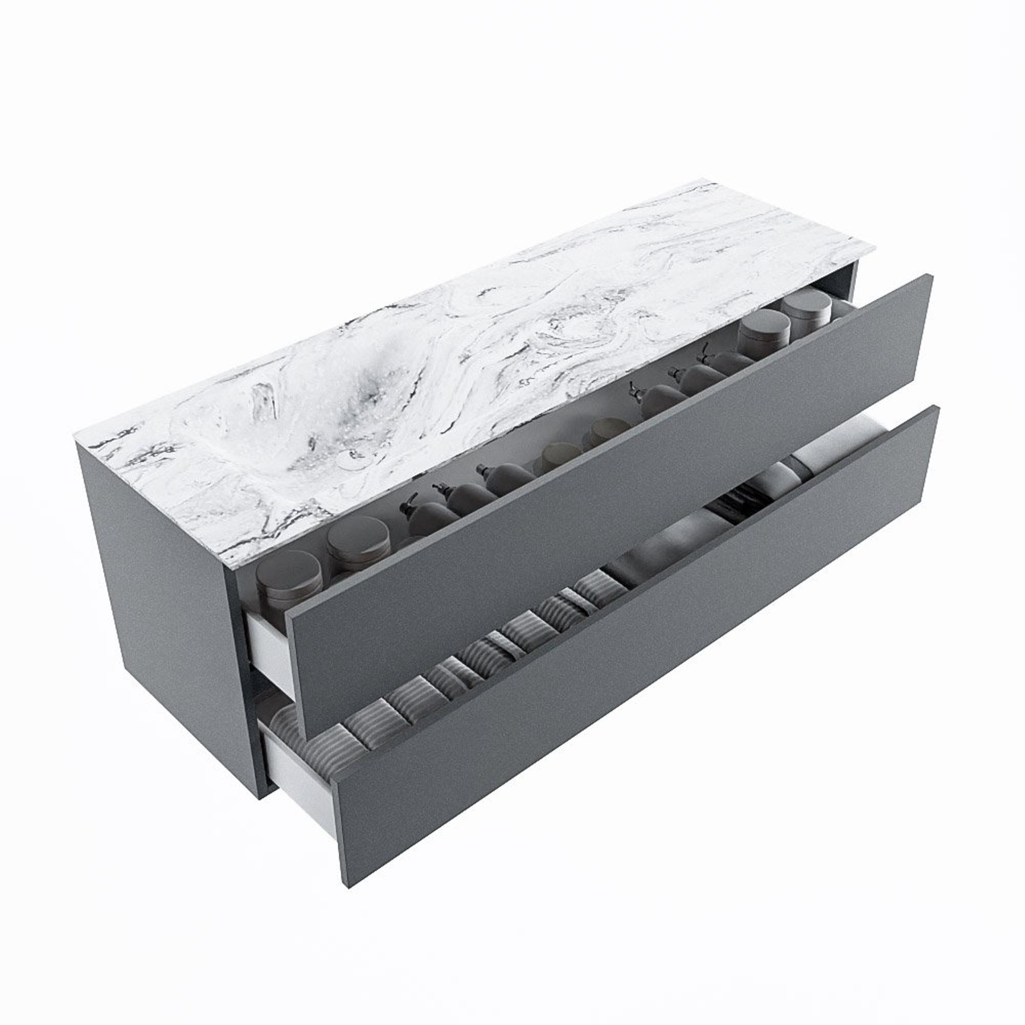 Le très beau set de meuble de salle de bains VICA DLUX est une magnifique pièce maîtresse dans votre salle de bains. Le lavabo en Solid surface marbré de CORIAN a une apparence élégante et intemporelle. Grâce à la forme douce et naturelle du lavabo, combinée avec le meuble bas de salle de bains intemporel et magnifique, le VICA-DLUX s’adapte bien aux différents styles de salles de bains. Pour parfaire entièrement le style de votre salle de bains, nous avons également les niches et supports de miroir dans la même couleur que le lavabo. Comme les niches Mondiaz et les tablettes de miroir. La série VICA DLUX se compose du meuble bas VICA à 2 ou 4 tiroirs, combiné avec un lavabo en Solid surface CORIAN avec structure marbre. Le lavabo en Solid surface CORIAN est disponible en 5 looks marbre. Avec cet ensemble de meuble de salle de bains, vous avez la belle apparence du marbre, mais aussi la facilité d’entretien et l’hygiène du Solid surface. Attention : Pour la variante XL (60cm), vous voyez les images/vidéos de la hauteur standard (50cm)