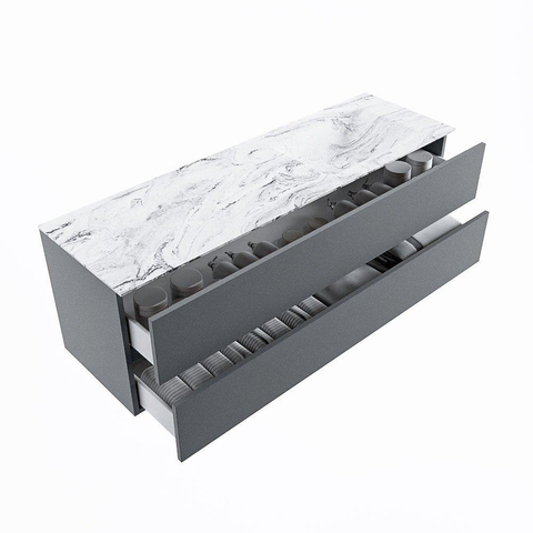 Le très beau set de meubles de salle de bains VICA DLUX est une magnifique pièce maîtresse dans votre salle de bains. Le lavabo Solid surface marbré en CORIAN a une apparence élégante et intemporelle. Grâce à la forme douce et naturelle du lavabo, combinée avec le sous-meuble de salle de bains magnifique et intemporel, le VICA-DLUX s’adapte bien aux différents styles de salles de bains. Pour parfaire entièrement le style de votre salle de bains, nous proposons également des niches et des supports de miroir dans la même couleur que le lavabo. Comme les niches Mondiaz et les tablettes de miroir. La série VICA DLUX se compose du sous-meuble VICA à 2 ou 4 tiroirs combiné avec un lavabo Solid surface CORIAN avec structure marbre. Le lavabo Solid surface CORIAN est disponible en 5 looks marbre. Avec cet ensemble de meuble de salle de bains, vous avez ce bel aspect marbre mais également la facilité d’entretien et l’hygiène du Solid surface. Attention : pour la variante XL (60cm), vous voyez les images/vidéos de la hauteur standard (50cm)