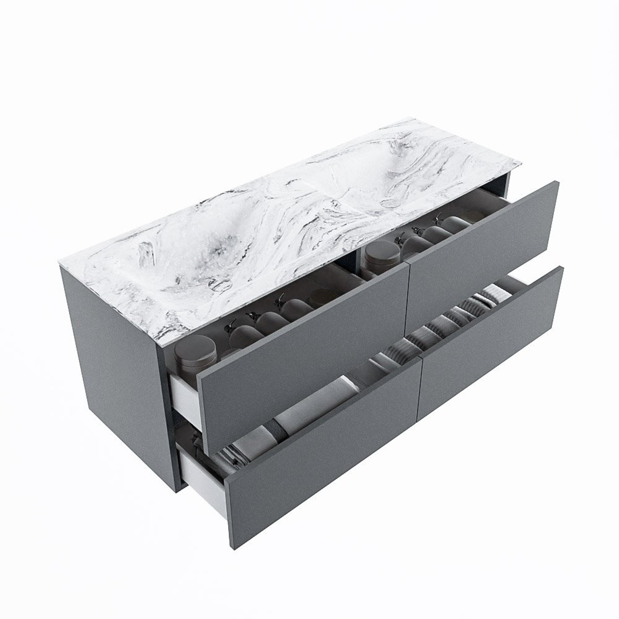 Le très beau set de meuble de salle de bains VICA DLUX est une magnifique pièce maîtresse dans votre salle de bains. Le lavabo en Solid surface marbré de CORIAN a une apparence élégante et intemporelle. Grâce à la forme douce et naturelle du lavabo, combinée avec le meuble bas de salle de bains intemporel et magnifique, le VICA-DLUX s’adapte bien aux différents styles de salles de bains. Pour finaliser entièrement le style de votre salle de bains, nous proposons également les niches et supports de miroir dans la même couleur que le lavabo. Comme les niches Mondiaz et les tablettes de miroir. La série VICA DLUX se compose du meuble bas VICA à 2 ou 4 tiroirs combiné avec un lavabo en Solid surface CORIAN avec une structure marbre. Le lavabo Solid surface CORIAN est disponible en 5 looks marbre. Avec cet ensemble de meuble de salle de bains vous avez cette belle apparence marbre mais aussi la facilité d’entretien et l’hygiène du Solid surface. Attention: Pour la variante XL (60cm) vous voyez les images/vidéos de la hauteur standard (50cm)