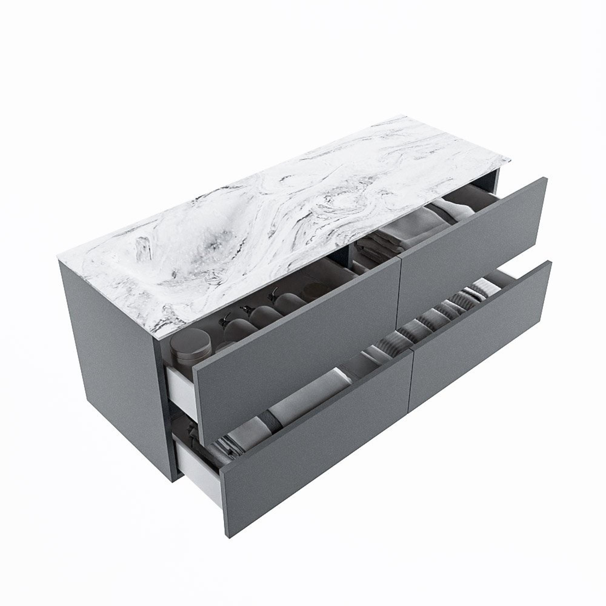 Le très beau set de meuble de salle de bains VICA DLUX est une magnifique pièce maîtresse dans votre salle de bains. Le lavabo en Solid surface marbré de CORIAN a une apparence élégante et intemporelle. Grâce à la forme douce et naturelle du lavabo, combinée avec le meuble bas de salle de bains intemporel et magnifique, le VICA-DLUX s’adapte bien aux différents styles de salles de bains. Pour parfaire entièrement le style de votre salle de bains, nous disposons également de niches et de supports de miroir dans la même couleur que le lavabo. Comme les niches Mondiaz et les tablettes de miroir. La série VICA DLUX se compose du meuble bas VICA à 2 ou 4 tiroirs combiné avec un lavabo Solid surface CORIAN avec structure marbre. Le lavabo Solid surface CORIAN est disponible en 5 looks marbre. Avec cet ensemble de meuble de salle de bains, vous avez la belle apparence du marbre mais également la facilité d’entretien et l’hygiène du Solid surface. Attention : pour la variante XL (60cm), vous voyez les images/vidéos de la hauteur standard (50cm)