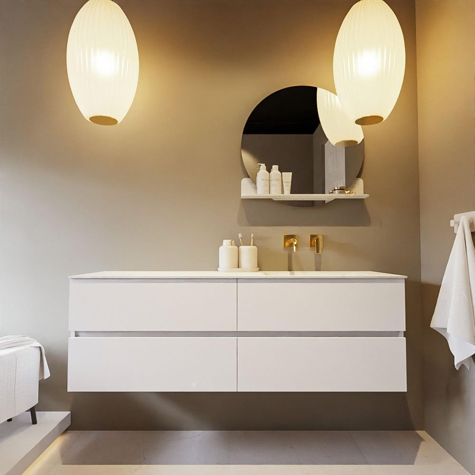 Le set de meuble de salle de bains extraordinairement beau VICA DLUX est une pièce maîtresse magnifique dans votre salle de bains. Le lavabo en Solid Surface marbré de CORIAN a une apparence élégante et intemporelle. Grâce à la forme douce et naturelle du lavabo, combinée avec le meuble bas de salle de bains intemporel et magnifique, le VICA-DLUX s'adapte bien aux différents styles de salles de bains. Pour compléter entièrement le style de votre salle de bains, nous avons également les niches et supports de miroir dans la même couleur que le lavabo. Comme les niches Mondiaz et les tablettes de miroir. La série VICA DLUX se compose du meuble bas VICA à 2 ou 4 tiroirs combiné avec un lavabo Solid Surface CORIAN avec structure marbre. Le lavabo Solid Surface CORIAN est disponible en 5 looks marbre. Avec cet ensemble de meuble de salle de bains, vous avez cette belle apparence de marbre mais également la facilité d'entretien et l'hygiène du Solid Surface. Attention : pour la variante XL (60cm), vous voyez les images/vidéos de la hauteur standard (50cm)