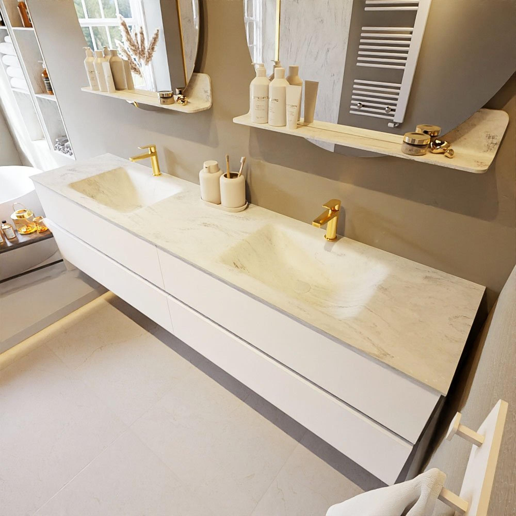 MONDIAZ VICA-DLUX Ensemble meuble de salle de bains - 200cm - meuble bas talc - 4 tiroirs - lavabo encastré cloud double - 2 trous de robinet - version haute 60cm - opalo