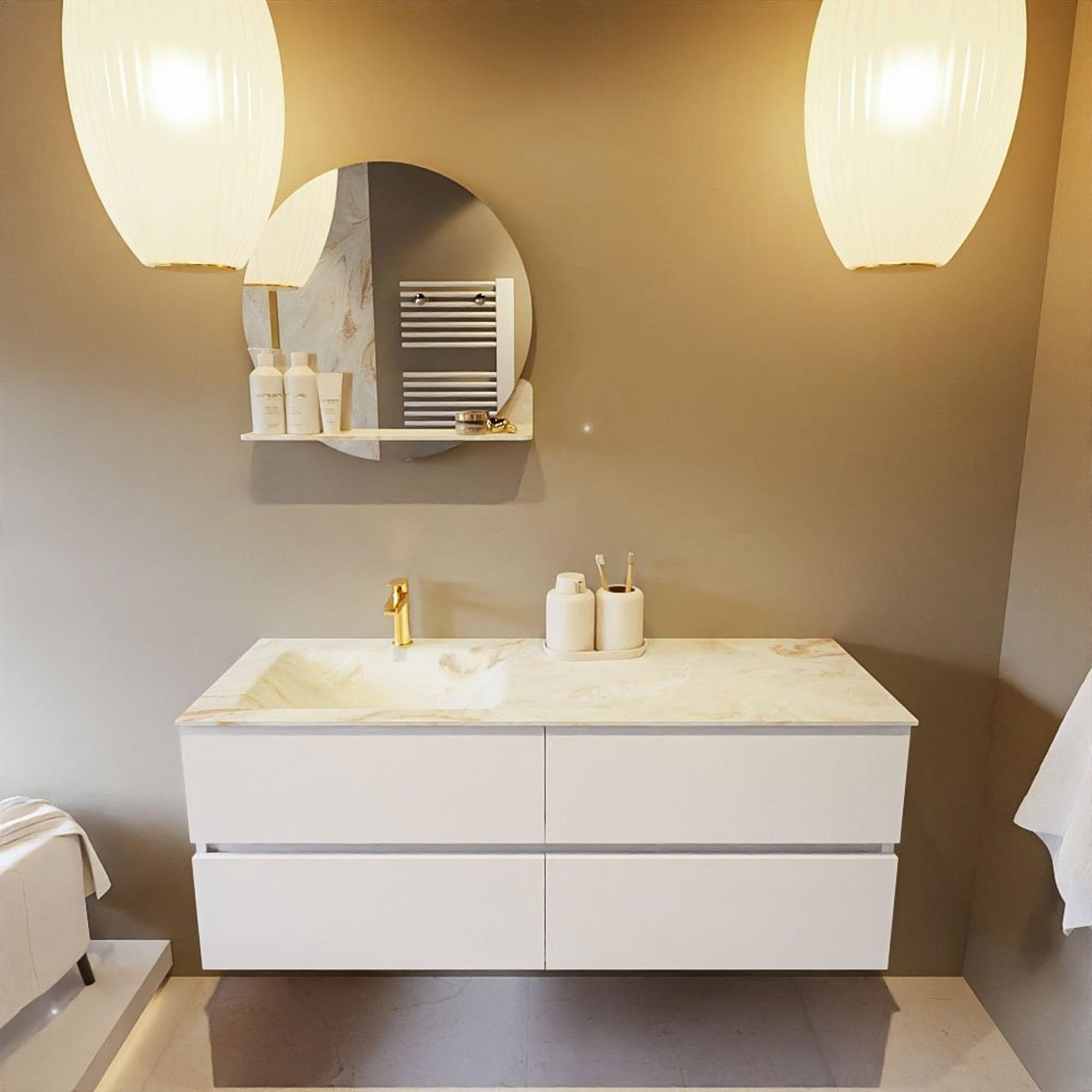Le très beau set de meuble de salle de bains VICA DLUX est une superbe pièce maîtresse dans votre salle de bains. Le lavabo en Solid surface marbré de CORIAN a une apparence élégante et intemporelle. Grâce à la forme douce et naturelle du lavabo, combinée avec le meuble bas de salle de bains intemporel et magnifique, le VICA-DLUX s’adapte bien aux différents styles de salles de bains. Pour parfaire entièrement le style de votre salle de bains, nous avons également les niches et supports de miroir dans la même couleur que le lavabo. Comme les niches Mondiaz et les tablettes de miroir. La série VICA DLUX se compose du meuble bas VICA à 2 ou 4 tiroirs combiné avec un lavabo en Solid surface CORIAN avec structure marbre. Le lavabo en Solid surface CORIAN est disponible en 5 looks marbre. Avec cet ensemble meuble de salle de bains, vous avez cette belle apparence de marbre mais également la facilité d’entretien et l’hygiène du Solid surface. Attention : Pour la variante XL (60cm), vous voyez les images/vidéos de la hauteur standard (50cm)