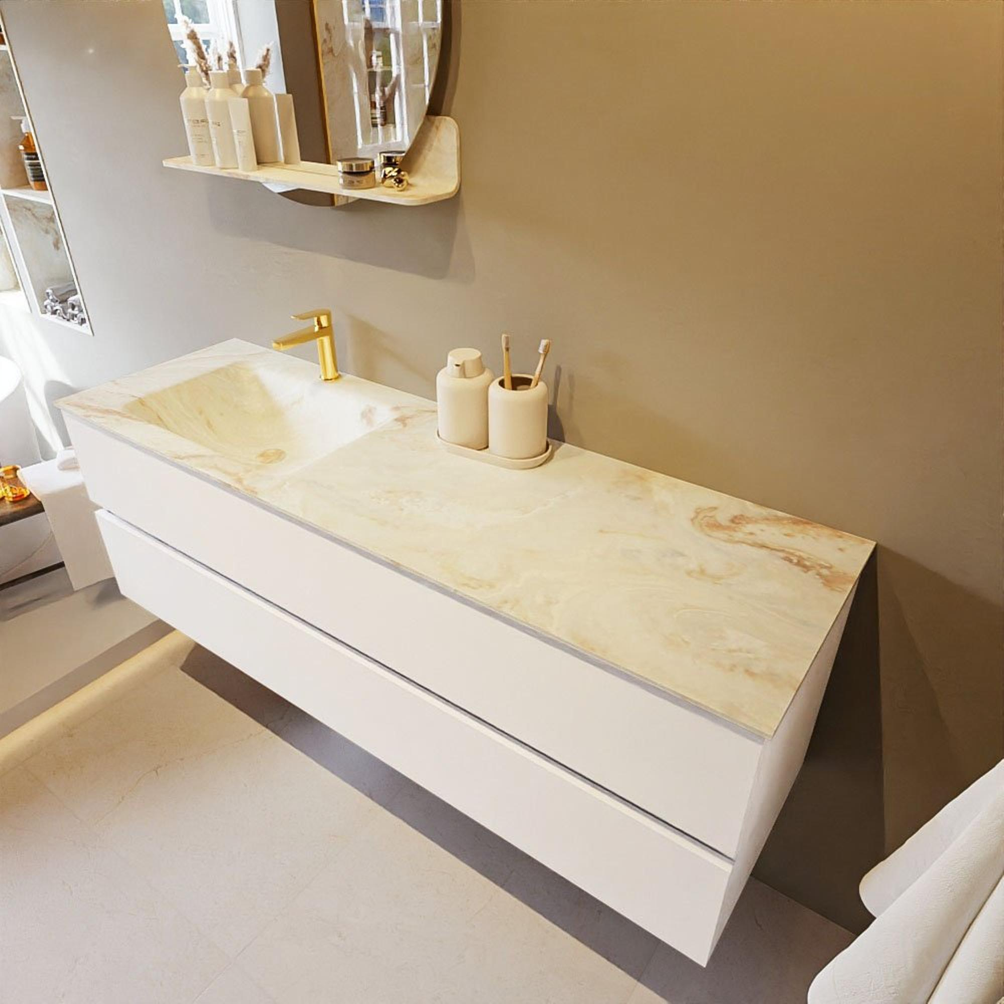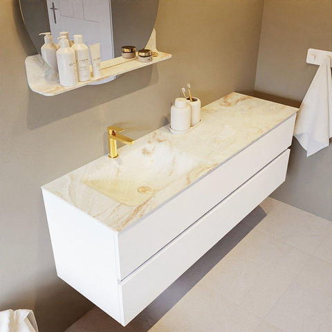 Le très beau set de meuble de salle de bains VICA DLUX est une magnifique pièce maîtresse dans votre salle de bains. Le lavabo Solid surface marbré en CORIAN a une apparence élégante et intemporelle. Grâce à la forme douce et naturelle du lavabo, combinée avec le meuble bas de salle de bains intemporel et magnifique, le VICA-DLUX s’adapte bien aux différents styles de salles de bains. Pour compléter le style de votre salle de bains, nous proposons également les niches et supports de miroir dans la même couleur que le lavabo. Comme les niches Mondiaz et les tablettes de miroir. La série VICA DLUX se compose du meuble bas VICA à 2 ou 4 tiroirs combiné à un lavabo Solid surface CORIAN avec structure marbre. Le lavabo Solid surface CORIAN est disponible en 5 looks marbre. Avec cet ensemble de meuble de salle de bains, vous obtenez cette belle apparence de marbre, tout en bénéficiant également de la facilité d’entretien et de l’hygiène du Solid surface. Attention : pour la variante XL (60cm), vous voyez les images/vidéos de la hauteur standard (50cm)