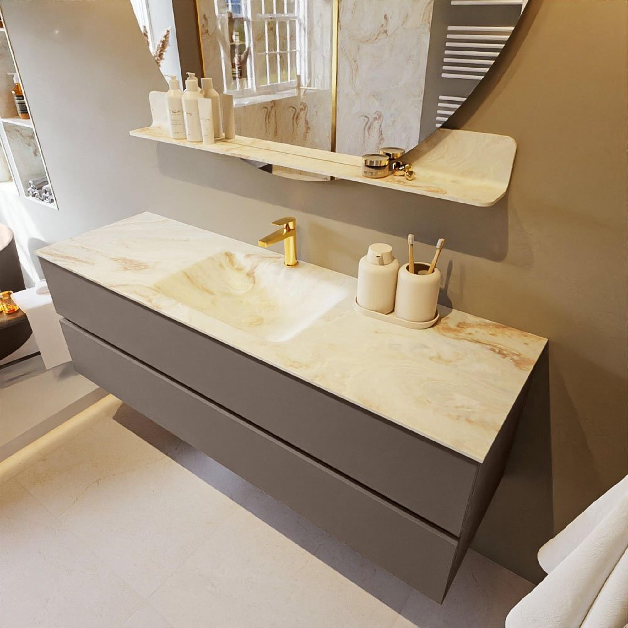 Le très beau set de meuble de salle de bains VICA DLUX est une superbe pièce maîtresse dans votre salle de bains. Le lavabo en Solid surface marbré de CORIAN a une apparence élégante et intemporelle. Grâce à la forme douce et naturelle du lavabo, combinée avec le meuble bas de salle de bains intemporel et magnifique, le VICA-DLUX s’accorde bien avec les différents styles de salles de bains. Pour parfaire entièrement le style de votre salle de bains, nous proposons également les niches et supports de miroir dans la même couleur que le lavabo. Comme les niches Mondiaz et les tablettes de miroir. La série VICA DLUX se compose du meuble bas VICA à 2 ou 4 tiroirs combiné avec un lavabo Solid surface CORIAN à structure marbre. Le lavabo Solid surface CORIAN est disponible en 5 looks marbre. Avec cet ensemble de meuble de salle de bains, vous bénéficiez de ce bel aspect marbre mais également de la facilité d’entretien et de l’hygiène du Solid surface. Attention : pour la variante XL (60cm), vous voyez les images/vidéos de la hauteur standard (50cm)