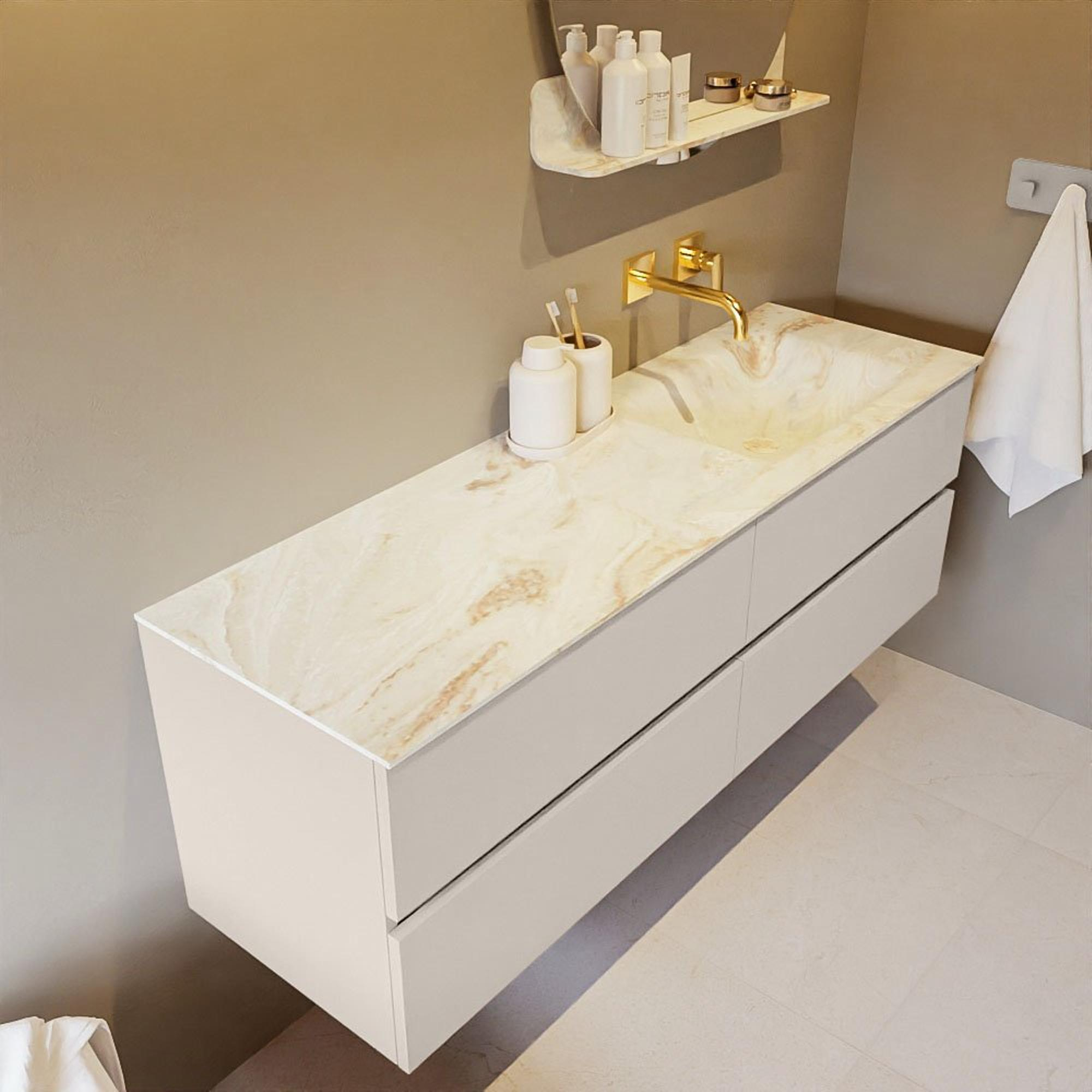 Le très beau set de meuble de salle de bains VICA DLUX est une magnifique pièce maîtresse dans votre salle de bains. Le lavabo Solid surface marbré en CORIAN a une apparence élégante et intemporelle. Grâce à la forme douce et naturelle du lavabo, combinée avec le meuble bas de salle de bains intemporel et magnifique, le VICA-DLUX s’adapte bien aux différents styles de salles de bains. Pour finaliser entièrement le style de votre salle de bains, nous proposons également les niches et les supports de miroir dans la même couleur que le lavabo, comme les niches Mondiaz et les tablettes de miroir. La série VICA DLUX se compose du meuble bas VICA à 2 ou 4 tiroirs combiné avec un lavabo Solid surface CORIAN avec structure marbre. Le lavabo Solid surface CORIAN est disponible en 5 looks marbre. Avec cet ensemble meuble de salle de bains, vous bénéficiez de ce bel aspect marbre mais également du confort et de l’hygiène du Solid surface. Attention : pour la variante XL (60cm), vous voyez les images/vidéos de la hauteur standard (50cm)