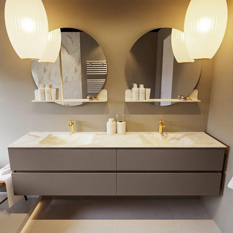 Le très beau set de meuble de salle de bains VICA DLUX est une splendide pièce maîtresse dans votre salle de bains. Le lavabo en Solid surface marbré de CORIAN a une apparence élégante et intemporelle. Grâce à la forme douce et naturelle du lavabo, combinée avec le meuble sous-vasque intemporel et magnifique, le VICA-DLUX s’adapte bien aux différents styles de salles de bains. Pour compléter entièrement le style de votre salle de bains, nous proposons également les niches et supports de miroir dans la même couleur que le lavabo. Comme les niches Mondiaz et les tablettes de miroir. La série VICA DLUX se compose du meuble sous-vasque VICA à 2 ou 4 tiroirs combiné avec un lavabo en Solid surface CORIAN avec structure marbre. Le lavabo Solid surface CORIAN est disponible en 5 finitions marbre. Avec cet ensemble de meuble de salle de bains, vous avez cette belle apparence marbre mais aussi la facilité d’entretien et l’hygiène du Solid surface. Attention : pour la variante XL (60cm), vous voyez les images/vidéos de la hauteur standard (50cm)