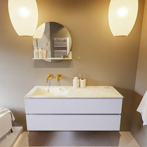 Le très beau set de meuble de salle de bains VICA DLUX est une magnifique pièce maîtresse dans votre salle de bains. Le lavabo en Solid surface marbré de CORIAN a une apparence élégante et intemporelle. Grâce à la forme douce et naturelle du lavabo, combinée avec le meuble bas de salle de bains intemporel et magnifique, le VICA-DLUX s'adapte bien aux différents styles de salles de bains. Pour parfaire totalement le style de votre salle de bains, nous disposons également de niches et de supports de miroir dans la même couleur que le lavabo, comme les niches Mondiaz et les tablettes de miroir. La série VICA DLUX se compose du meuble bas VICA à 2 ou 4 tiroirs, combiné avec un lavabo en Solid surface CORIAN avec structure marbre. Le lavabo en Solid surface CORIAN est disponible en 5 aspects marbre. Avec cet ensemble de meuble de salle de bains, vous avez cette belle apparence marbre mais aussi la facilité d'entretien et l'hygiène du Solid surface. Attention : pour la variante XL (60cm), vous voyez les images/vidéos de la hauteur standard (50cm)