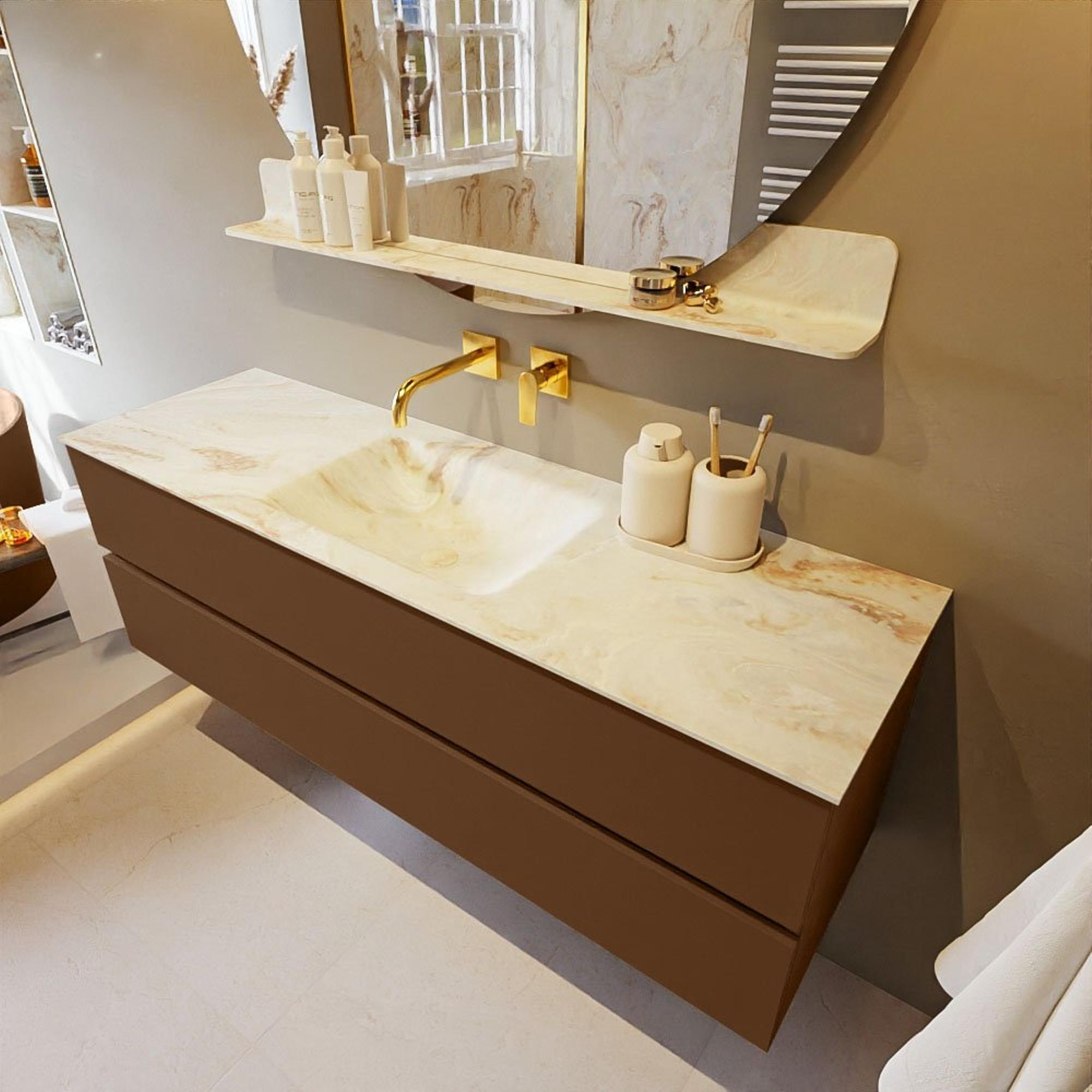 Le très beau set de meuble de salle de bains VICA DLUX est une superbe pièce maîtresse dans votre salle de bains. La vasque en Solid surface marbré de CORIAN a une apparence élégante et intemporelle. Grâce à la forme douce et naturelle de la vasque, combinée avec le meuble bas de salle de bains intemporel et magnifique, le VICA-DLUX s’adapte bien aux différents styles de salles de bains. Pour parfaire entièrement le style de votre salle de bains, nous proposons également des niches et des supports de miroir dans la même couleur que la vasque. Comme les niches Mondiaz et les tablettes de miroir. La série VICA DLUX se compose du meuble bas VICA à 2 ou 4 tiroirs combiné avec une vasque en Solid surface CORIAN avec structure marbre. La vasque Solid surface CORIAN est disponible en 5 looks marbre. Avec cet ensemble de meubles de salle de bains, vous bénéficiez de ce bel aspect marbre tout en profitant également de la facilité d’entretien et de l’hygiène du Solid surface. Attention : Pour la variante XL (60cm), vous voyez les images/vidéos de la hauteur standard (50cm)