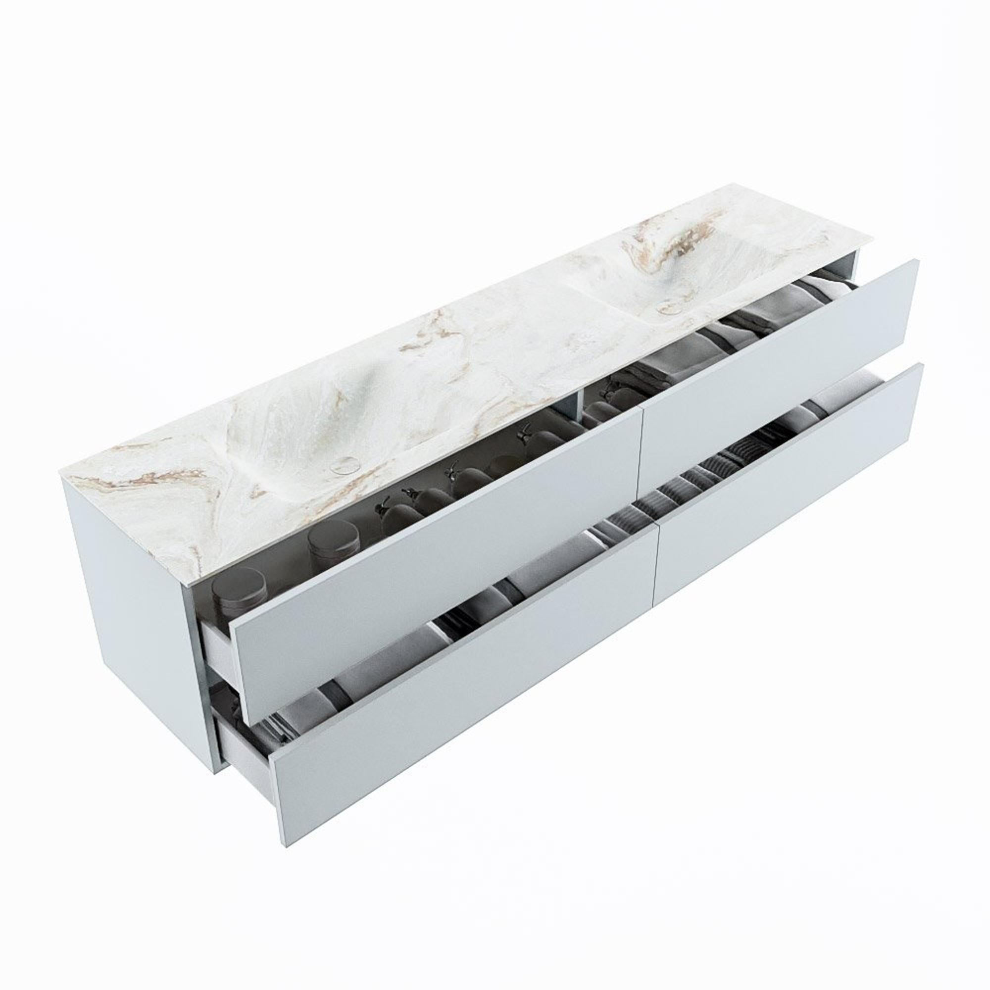 MONDIAZ VICA-DLUX Ensemble meuble de salle de bains - 200cm - meuble bas clay - 4 tiroirs - vasque encastrée cloud double - 2 trous de robinet - version haute 60cm - frape