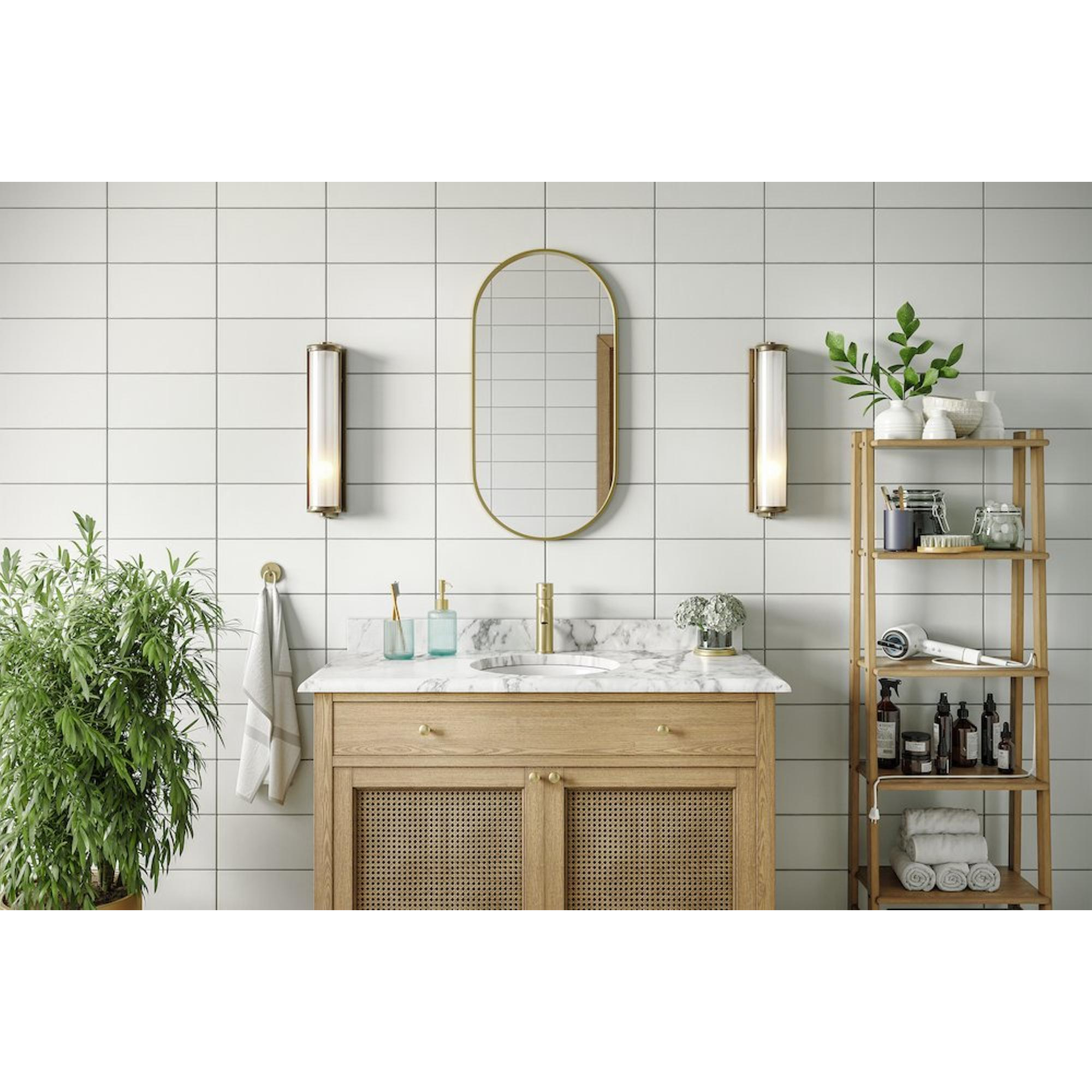 Le cadre fin en or brossé donne à votre salle de bains une sensation d'hôtel de luxe, mais reste discret et sobre grâce à son éclat mat. La forme ovale adoucit les lignes droites des carreaux et des meubles et crée un joli contraste avec les lavabos et meubles rectangulaires. Combinez le miroir avec des robinets et des accessoires de la même couleur dorée pour créer un ensemble harmonieux, ou utilisez-le justement comme pièce maîtresse sur un mur clair et sobre. Vous rehaussez ainsi d'un seul coup l'apparence de votre salle de bains, sans devoir rénover.