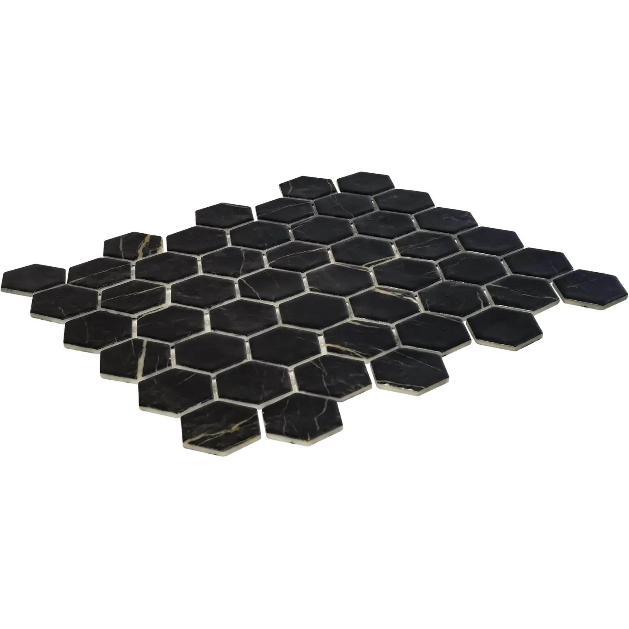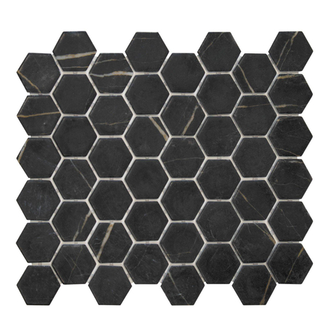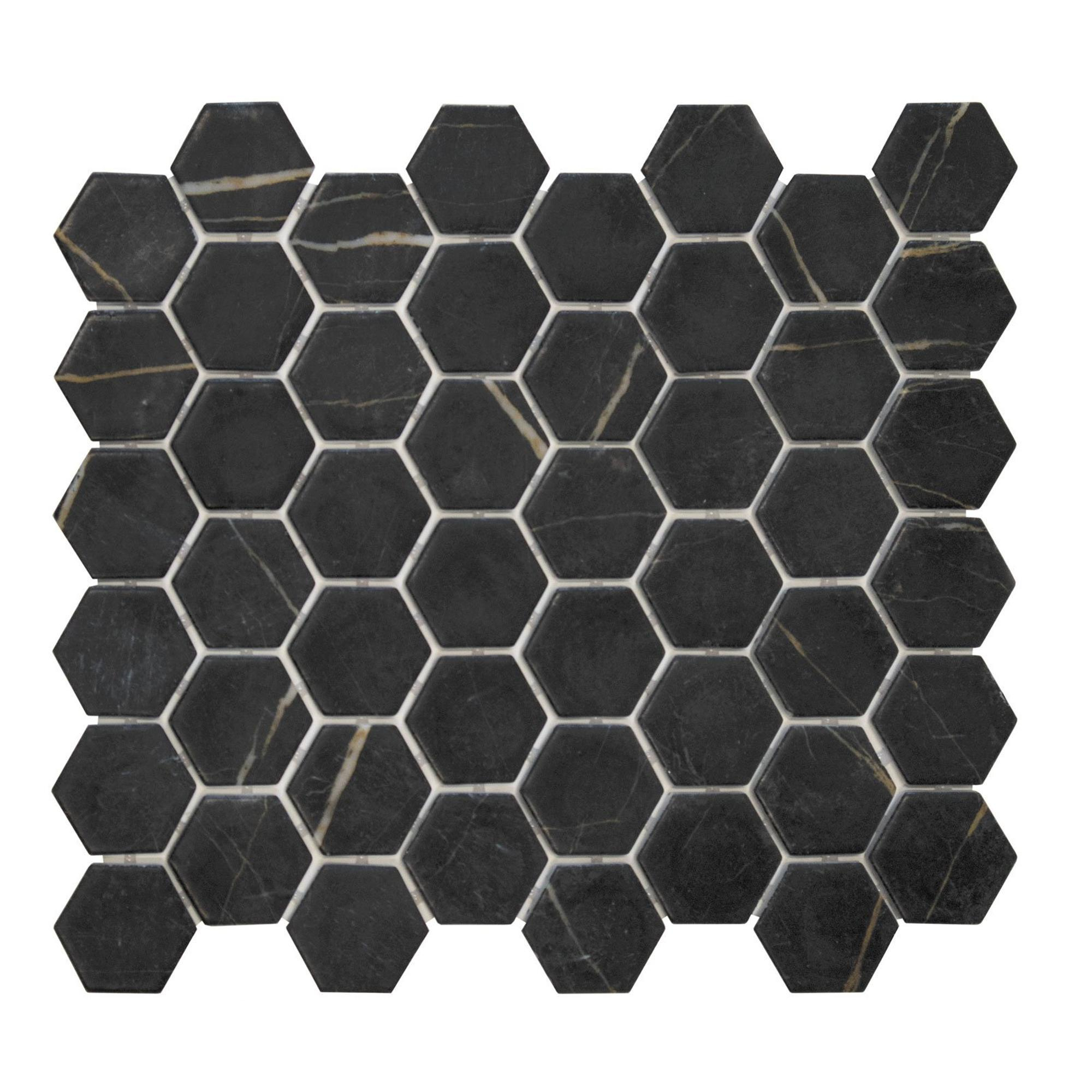 La combinaison d’une impression marbre noire profonde avec une douce brillance mate donne immédiatement une atmosphère luxueuse à votre espace, sans qu’il ne devienne trop chargé ou trop brillant. La forme hexagonale crée un effet graphique qui attire immédiatement l’attention, tout en restant intemporel. Ainsi, vous pouvez très bien combiner ce carreau avec des sols effet béton sobres, des sanitaires blancs épurés ou des tons bois chaleureux. Utilisez la mosaïque comme bande d’accent dans la douche, comme crédence dans la cuisine ou au contraire comme sol continu pour une ambiance boutique-hôtel chez vous. L’effet marbre ajoute de la richesse, tandis que le motif sur le filet forme un ensemble calme et rythmé.Verre recyclé durable pour un usage intensif