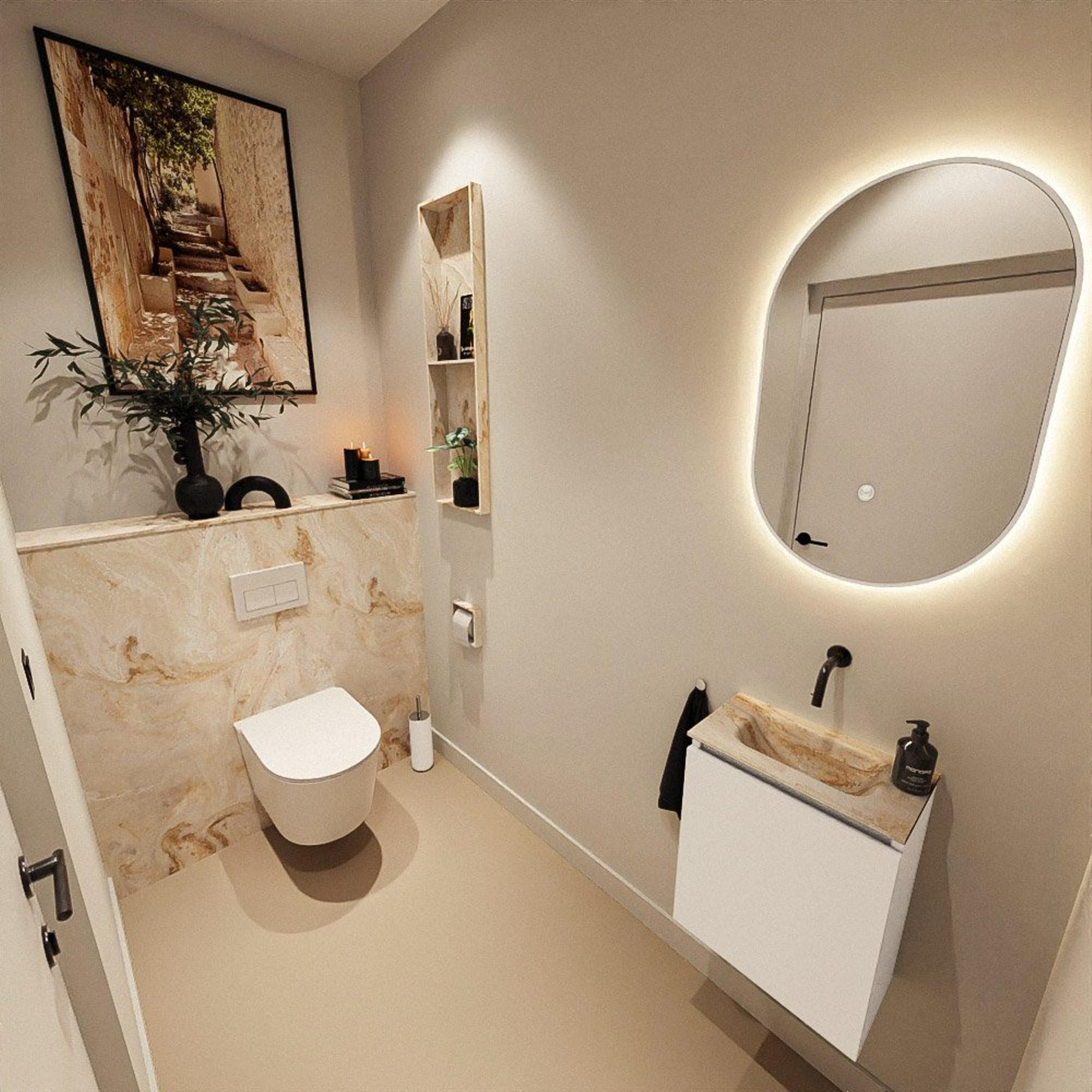 La combinaison du meuble couleur Talc et du lavabo Eden en Frappe (un marbre beige doux) crée un aspect raffiné et moderne. La façade sans poignée renforce les lignes épurées, de sorte que le meuble s’accorde parfaitement avec des carreaux modernes, des robinets noirs ou au contraire des tons bois chaleureux. Le plan est réalisé en solid surface et s’aligne parfaitement sur le lavabo, ce qui crée un aspect haut de gamme, presque sans joints. Grâce aux couleurs neutres et claires, vous pouvez facilement combiner ce meuble avec différents styles : d’un style scandinave clair et apaisant à un style chic et digne d’un hôtel avec des accents sombres. Votre toilette ou salle de bains reste ainsi intemporelle et vous pouvez facilement modifier l’ambiance plus tard à l’aide d’accessoires.