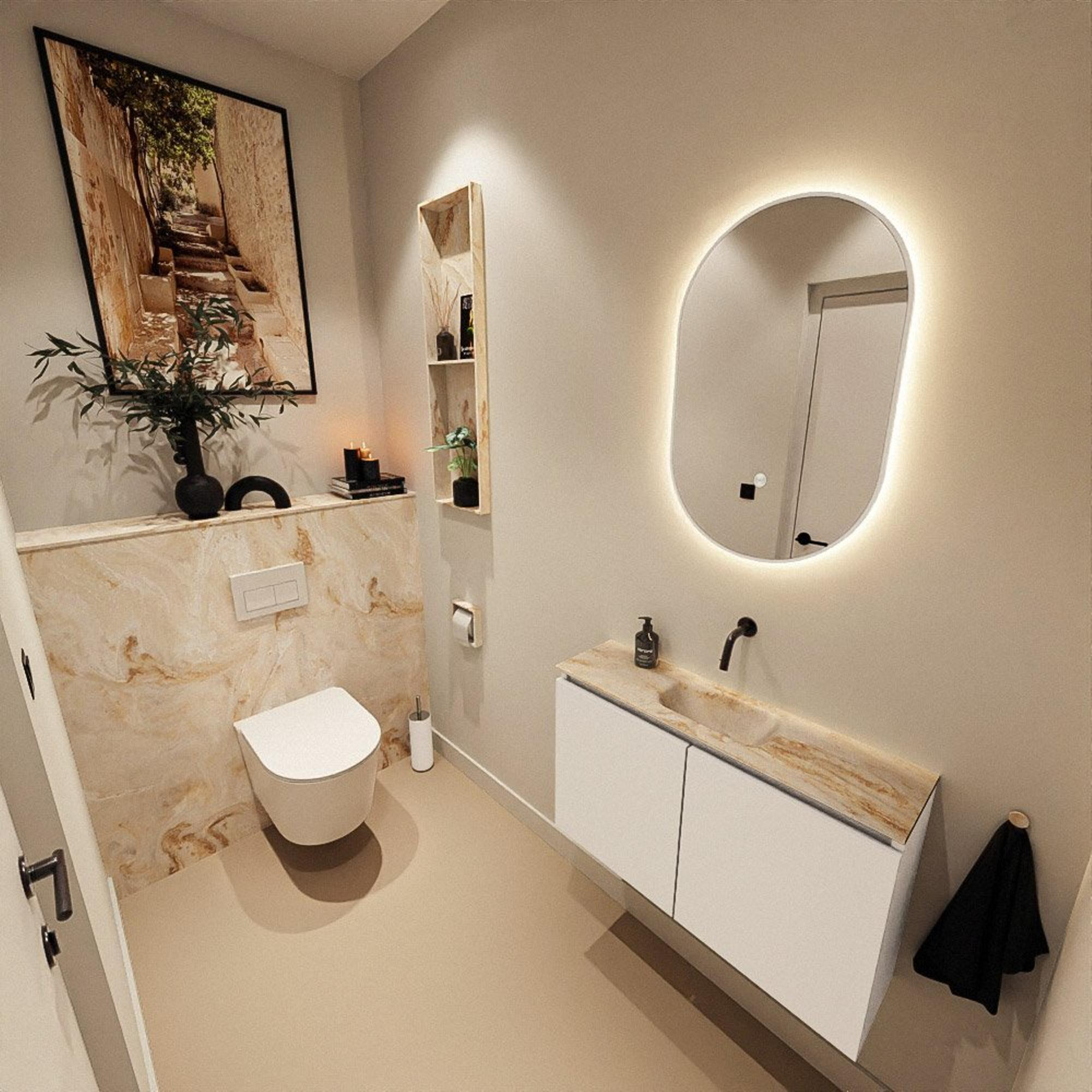 La douce teinte Talc du meuble s’accorde à merveille avec la couleur Frappe du lavabo EDEN. Ensemble, ils forment une base moderne et apaisante qui se combine facilement avec des carreaux blancs, beiges ou au contraire foncés. La façade sans poignée renforce l’apparence minimaliste et luxueuse : aucune interruption dans la vue d’ensemble, mais un seul panneau épuré qui confère immédiatement un caractère haut de gamme à vos toilettes. Le lavabo beige en solid surface ajoute subtilement de la chaleur et rend l’ensemble moins clinique qu’un lavabo blanc standard. Vous créez ainsi facilement une ambiance digne d’un hôtel, même dans un petit WC.