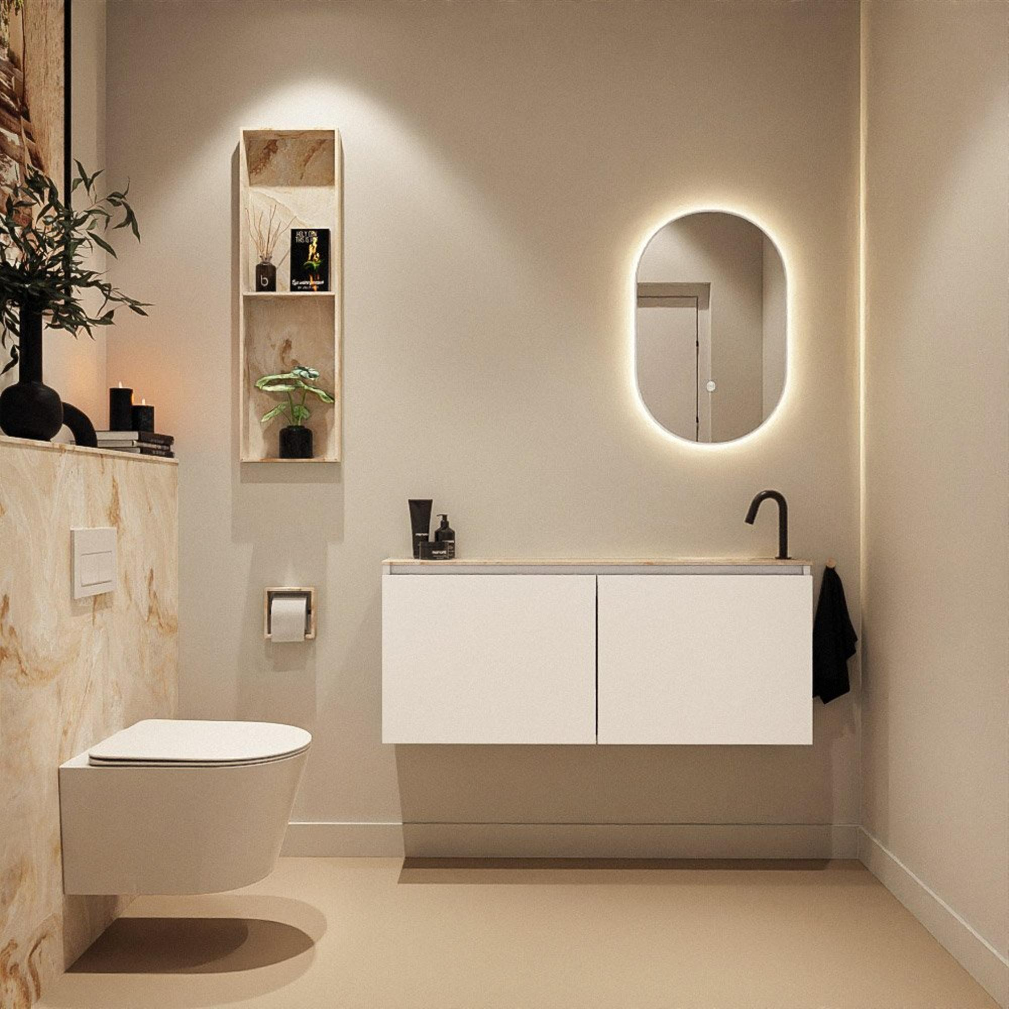 La douce teinte Talc du meuble, associée au lavabo Eden en Frappe, offre une apparence moderne et raffinée. Ces couleurs sont chaleureuses et neutres et se combinent donc facilement avec différents types de carrelages, tels que l’effet béton, l’effet marbre ou les sobres carreaux muraux blancs. Les façades sans poignées créent une apparence épurée et minimaliste, sans interruptions, ce qui donne à la pièce une impression de grandeur. Grâce à cette base de couleurs apaisantes, vous pouvez jouer avec des touches de couleur via les accessoires et les serviettes, ou au contraire conserver une ambiance très sereine et ton sur ton. Vous créez ainsi facilement un ensemble harmonieux qui restera frais et contemporain pendant de nombreuses années.