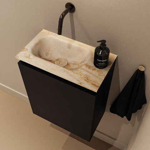 Le meuble dans la couleur Urban (teinte noire) donne à vos toilettes un aspect moderne et robuste qui se combine à merveille avec des robinets noirs, des accessoires foncés et des carreaux effet béton ou bois. Le plan supérieur et le lavabo de couleur Frappe forment un contraste beige doux, légèrement marbré, qui rend l’ensemble chaleureux et accueillant. Cette combinaison s’inscrit parfaitement dans les tendances actuelles de la salle de bains où les teintes naturelles et les détails noirs se rejoignent. Grâce au design sans poignée, le meuble paraît épuré et calme, ce qui est particulièrement important dans un petit espace. Vous créez ainsi une ambiance d’hôtel luxueuse dans vos toilettes, sans que cela paraisse chargé ou désordonné.
