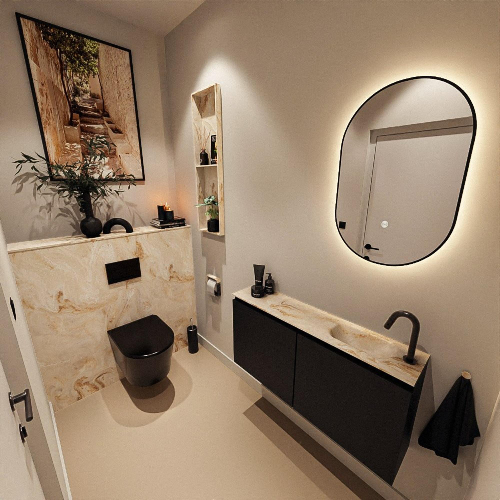 La combinaison de la couleur Urban pour le meuble et du lavabo Frappe offre un aspect contemporain et luxueux. Le meuble sombre forme un contraste élégant avec le plan vasque clair dans une teinte beige, qui s'accorde parfaitement avec des toilettes modernes, industrielles ou de style hôtel chic. Les lignes droites et la finition sans poignées créent un aspect calme, ce qui permet d'associer facilement le meuble à des robinets noirs, des accessoires mats ou au contraire à des tons bois chaleureux. Vous pouvez ainsi harmoniser entièrement vos toilettes avec le reste de votre intérieur et créer un style cohérent et bien pensé.