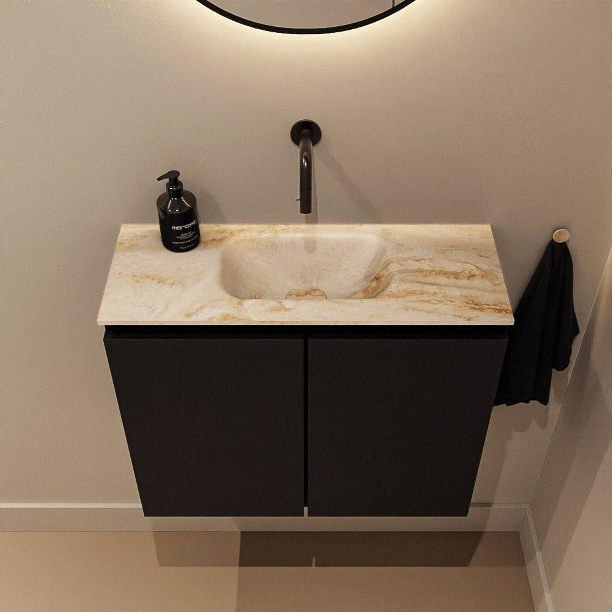 La couleur Urban sombre du meuble bas, en combinaison avec le lavabo couleur Frappe, crée une apparence moderne façon hôtel. La teinte beige chaleureuse du plan en solid surface forme un beau contraste avec le meuble profond, presque noir, et se marie facilement avec des matériaux naturels tels que des carreaux effet bois ou effet béton. Grâce au design sans poignées, l’ensemble reste épuré et minimaliste, sans interruption dans la façade. Cela rend ce meuble particulièrement adapté si vous aimez une salle de bains ou un WC calme et moderne, où les détails sont soignés et les couleurs harmonieusement assorties.