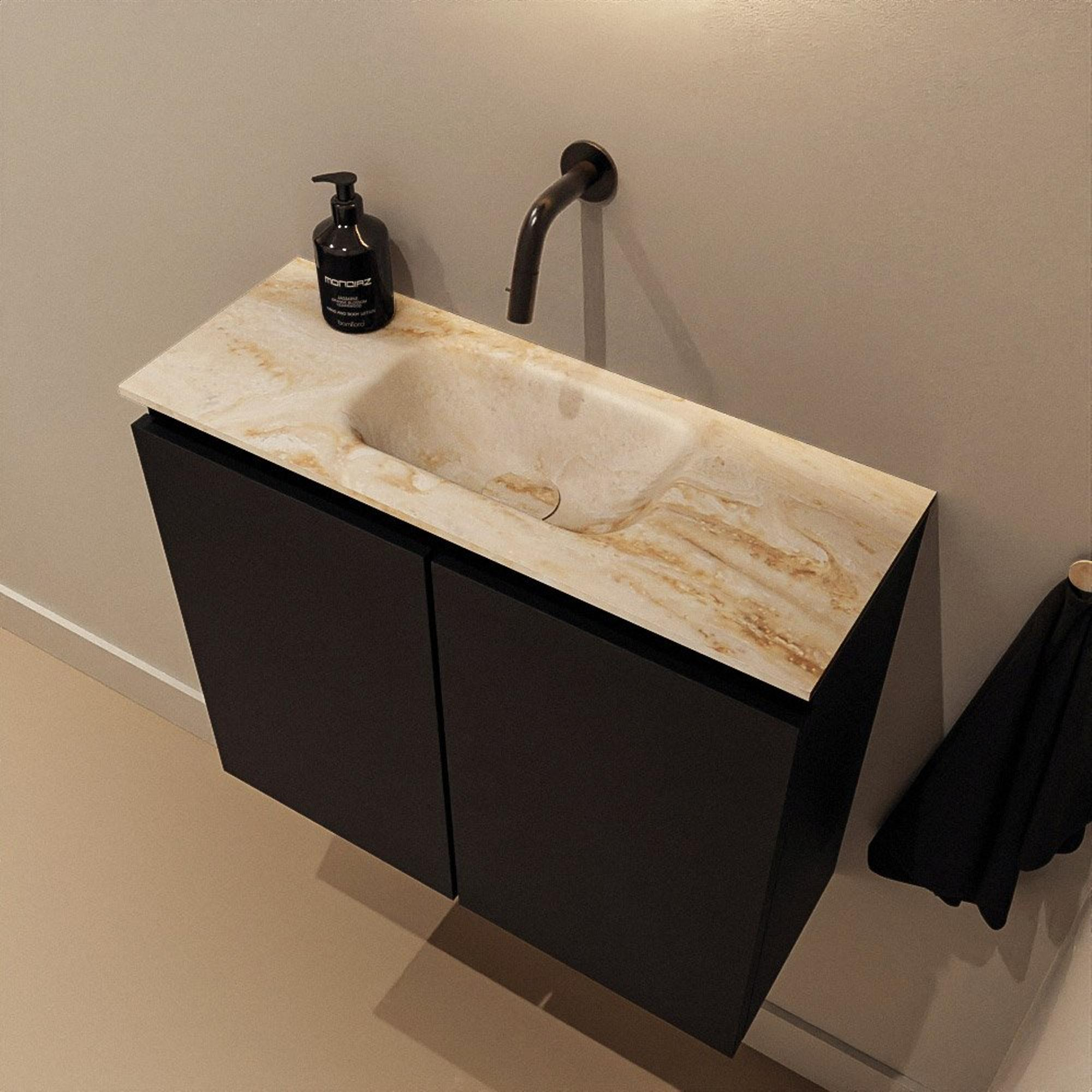 Avec une largeur de 60 cm et une profondeur de seulement 23 cm, ce meuble est idéal pour les WC, les petites salles de bains ou les niches étroites où chaque centimètre compte. La faible profondeur vous laisse suffisamment d’espace pour circuler, tout en disposant d’un point d’eau fonctionnel avec un lavabo au centre. Grâce à la fixation murale, le meuble semble flotter, ce qui libère le sol et donne à vos toilettes une impression de grandeur. Ce n’est pas seulement esthétique, mais aussi pratique : le sol en dessous est facile à nettoyer, sans recoins compliqués ni zones difficiles d’accès. Vous combinez ainsi une sensation d’espace avec une fonctionnalité astucieuse, exactement ce qu’il faut dans un espace compact.
