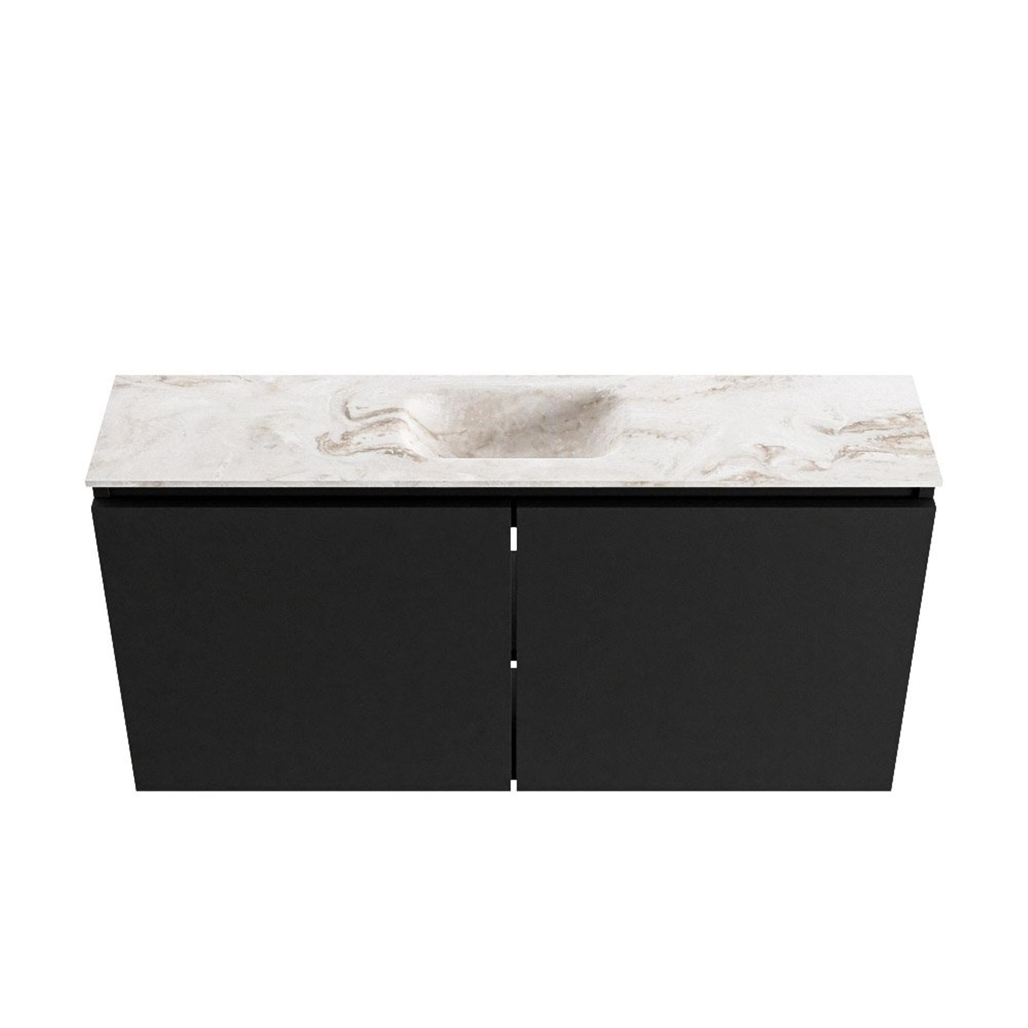 La finition Urban du meuble crée un look moderne, presque industriel, avec un aspect noir affirmé, tandis que le lavabo Eden dans la douce teinte Frappe apporte justement chaleur et raffinement. Cette combinaison de noir avec une couleur beige/clair à l’aspect marbré fait de ce meuble un véritable accroche-regard, sans être criard. Les façades sans poignées renforcent le caractère minimaliste et s’accordent parfaitement avec les tendances de carrelage contemporaines telles que l’effet béton, le bois en chevron ou les grands carreaux aspect pierre naturelle. Grâce à la palette de couleurs neutres, vous pouvez en plus varier facilement les accessoires : du robinet noir mat et porte-rouleau de papier toilette aux détails dorés, presque tout s’accorde sans effort.