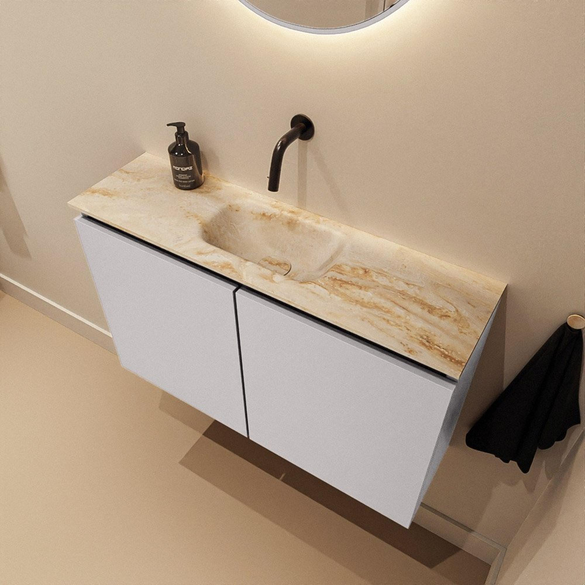 - Combinaison élégante de meuble gris (Cale) avec lavabo Frappe beige pour une apparence chaleureuse et moderne.