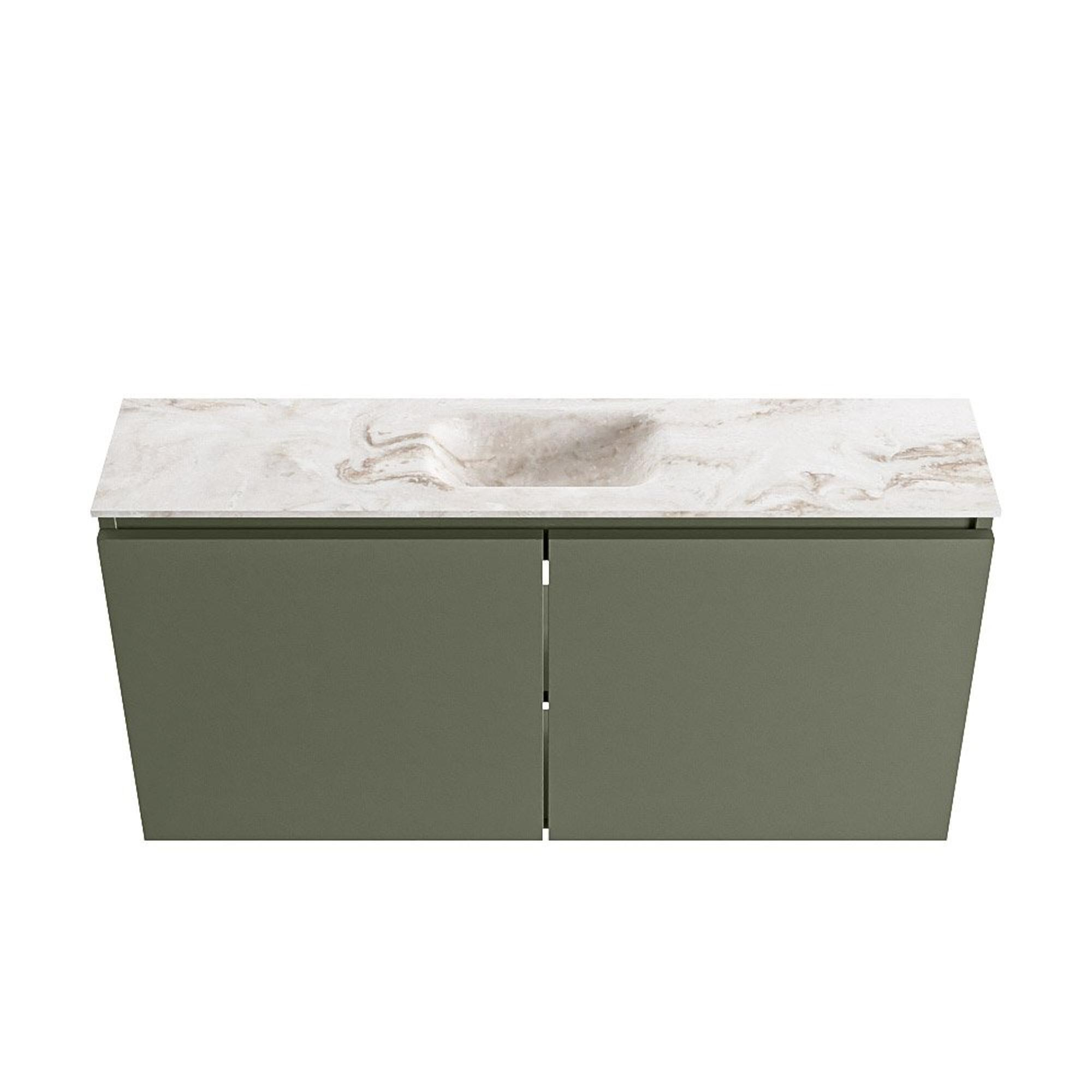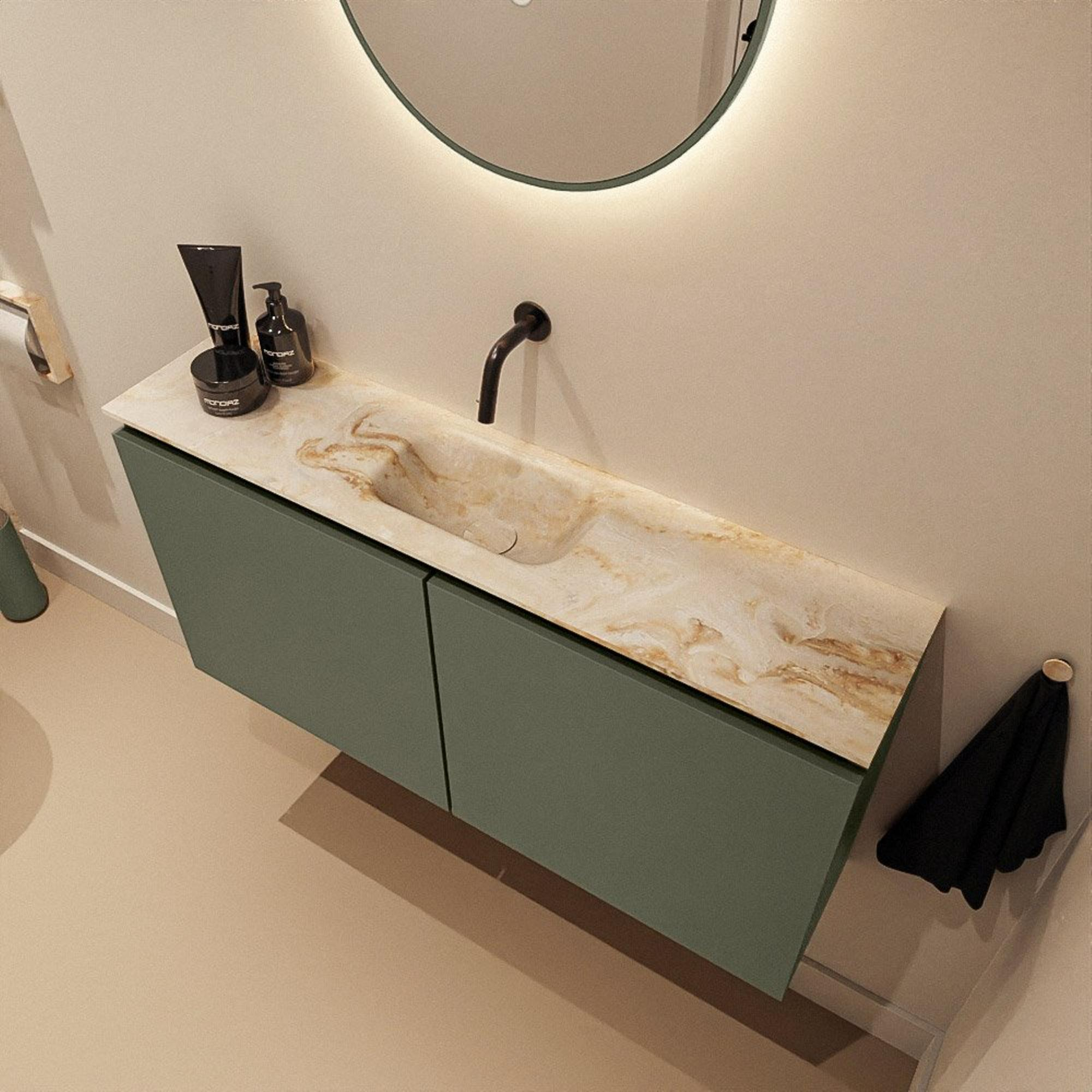- Couleur Army robuste pour le meuble, combinée à un plan de lavabo Frappe beige pour une apparence chaleureuse et moderne.